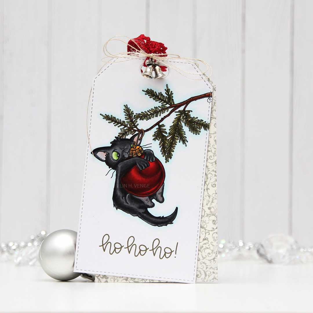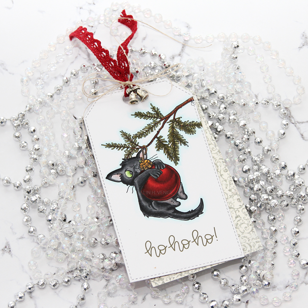 Underneath the kitten I stamped ho ho ho from the Scripty Xmas stamp set from Mama Elephant, using that same Olive Twist color ink. I added a bit of red lacey ribbon to the hole on the top of the tag, tied a bow around it using a very fine thread that I think is meant for warping looms, it used to be my grandmother’s. I added a little bell charm to the bow, I thought it was a nice finishing touch.