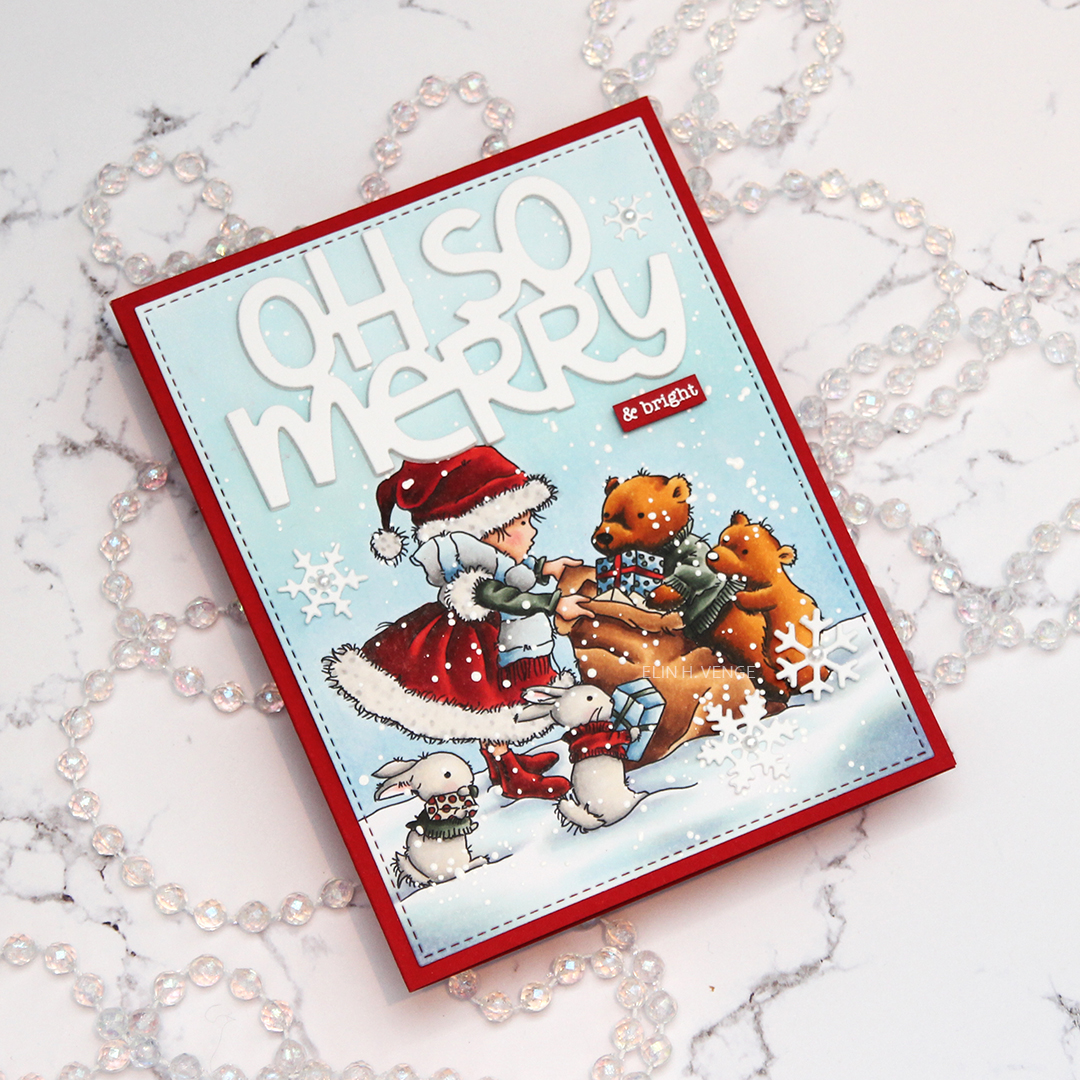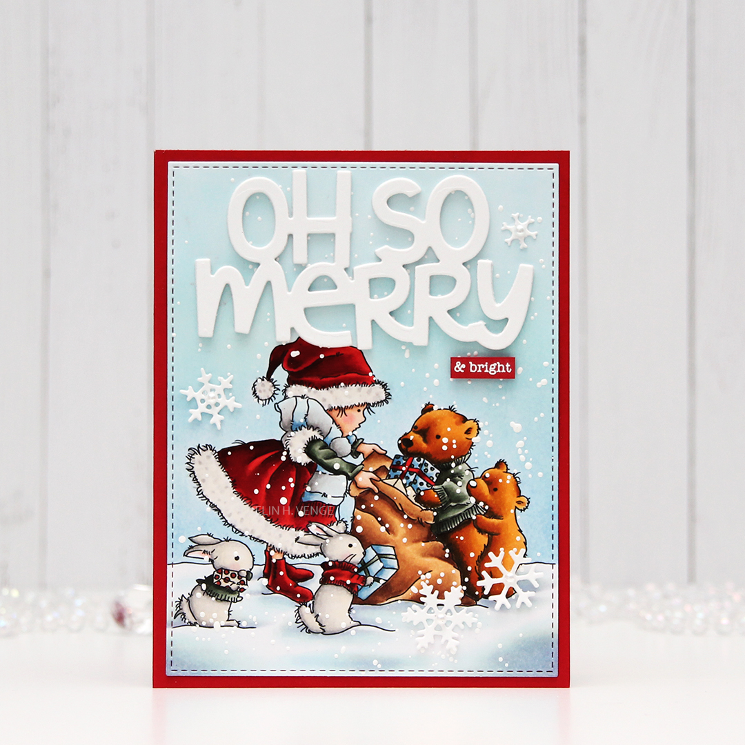 I die cut the words oh so merry from the Penguin’s Waddle die set from Mama Elephant a few times from white cardstock and stacked them for a dimensional look. I added chunky white embossing enamel to my scene, glued my panel onto a card base made from Pure Poppy cardstock from Papertrey Ink and glued my diecut words in the sky. I stamped and white heat embossed “& bright” from the Holiday messages stamp set from Mama Elephant onto a scrap of the same red cardstock and glued that below my diecut words. I added a few diecut snowflakes with pearls in the centers as my finishing touch.