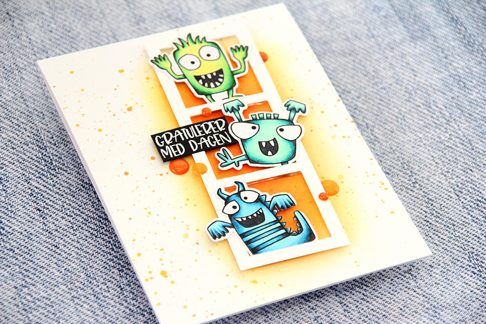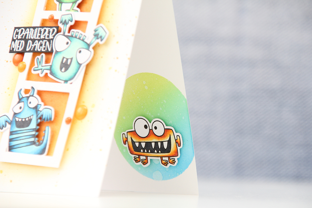 I had four monsters, so Liz urged me to put the last one on an ink blended circle on the inside. I asked her if she wanted paint splatters on the inside too, before I removed my circle mask. She wanted water splatters, so I added water splatters. I had a great time being remote controlled by her!