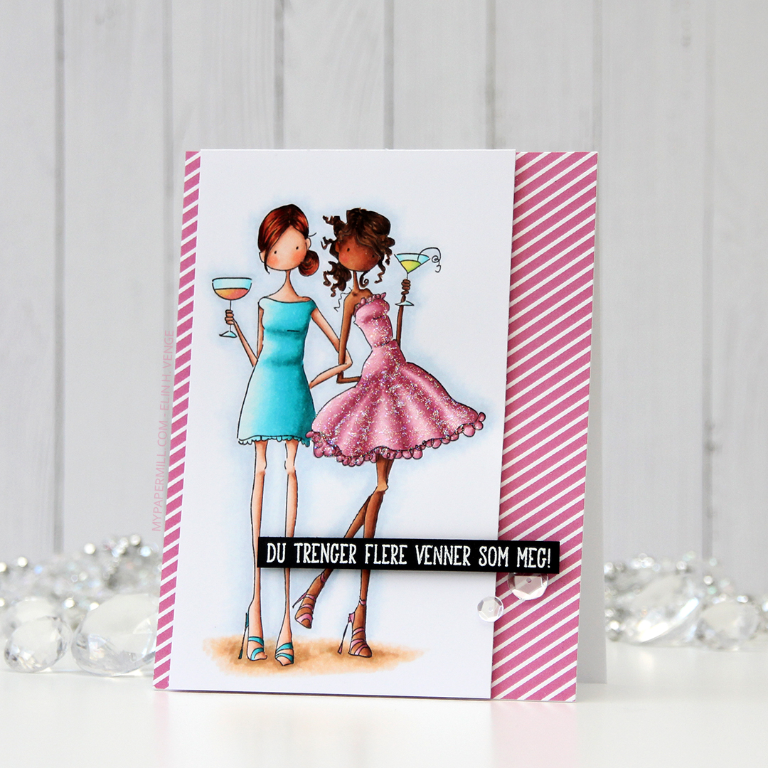 I colored up Victoria and Juliette’s Night Out from Stamping Bella for day 15 of the most recent round of Kathy Racoosin’s coloring challenge on Instagram, and the image has now made its way to a card.