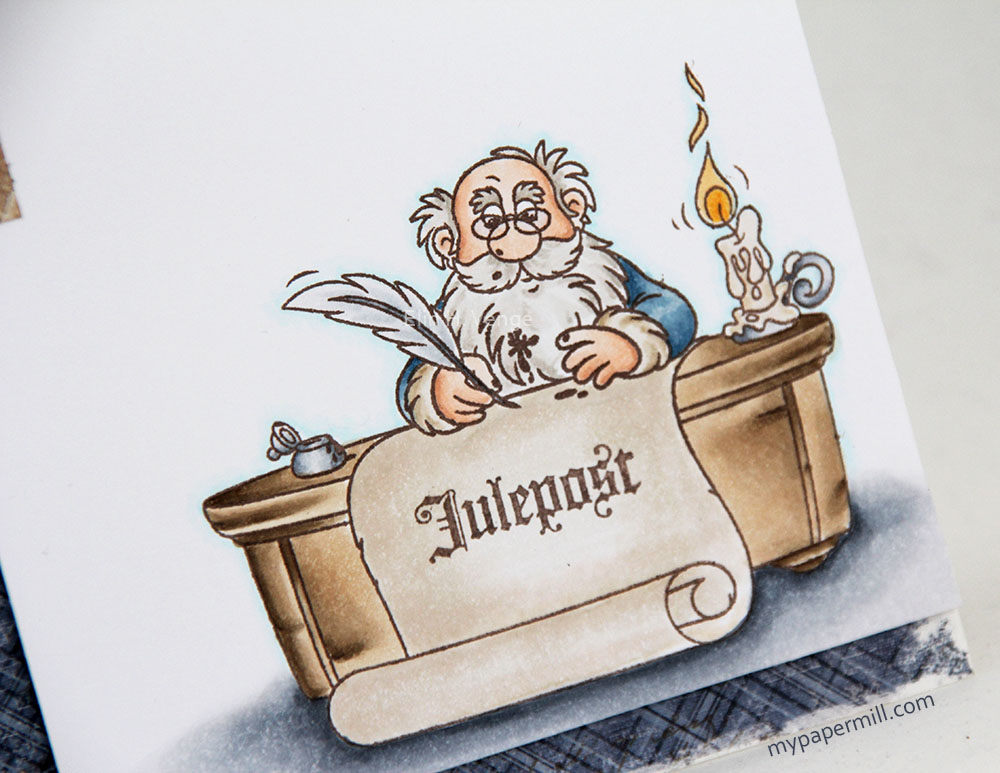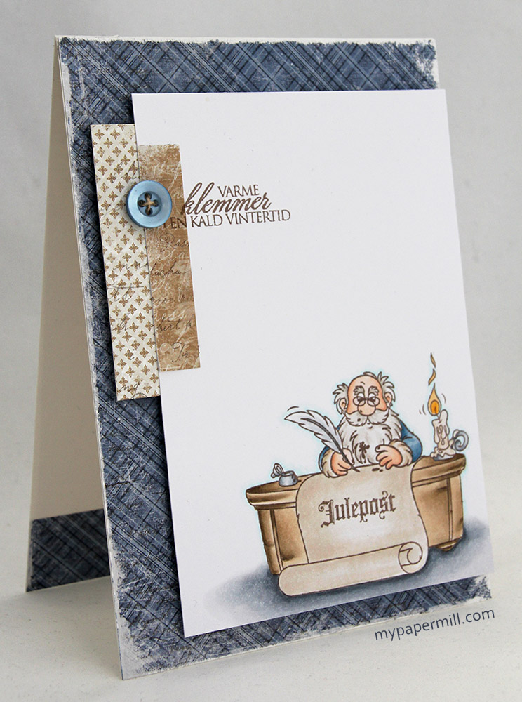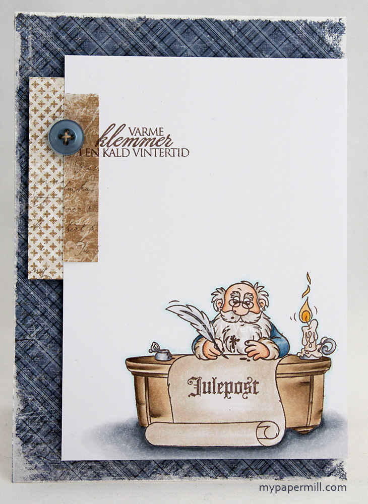 On the second inside I’ve made a pocket to make room for a tag with a personal greeting, diecut using a Magnolia Doohickey die (Jolly Tags). I’ve added a seam binding bow to the tag and a jute string bow on top with a button from My Mind’s Eye to finish it off. The Stempelglede text stamp on the pocket is stamped with Memento Rich Cocoa ink and I’ve added 3 pearls from Kort & Godt as the last little finish on this second inside.