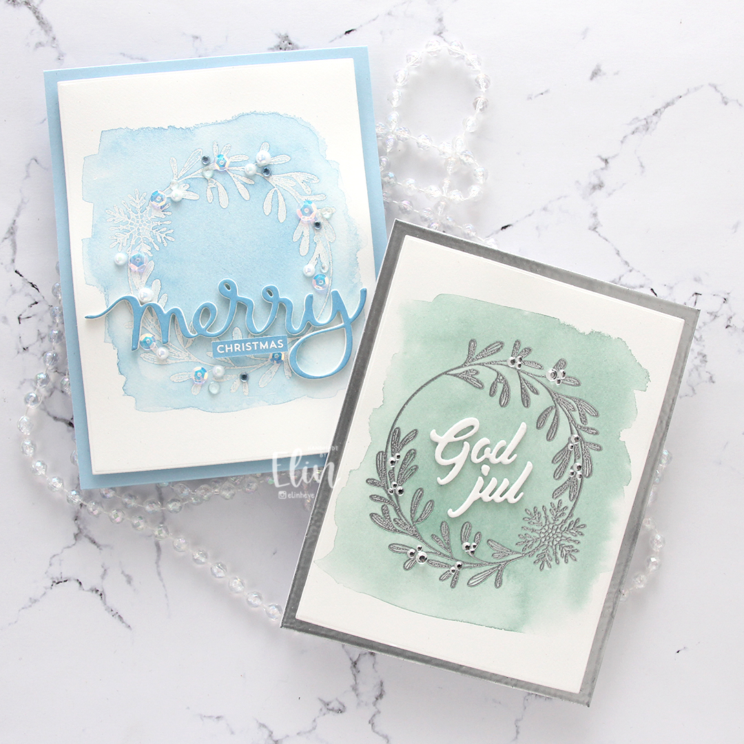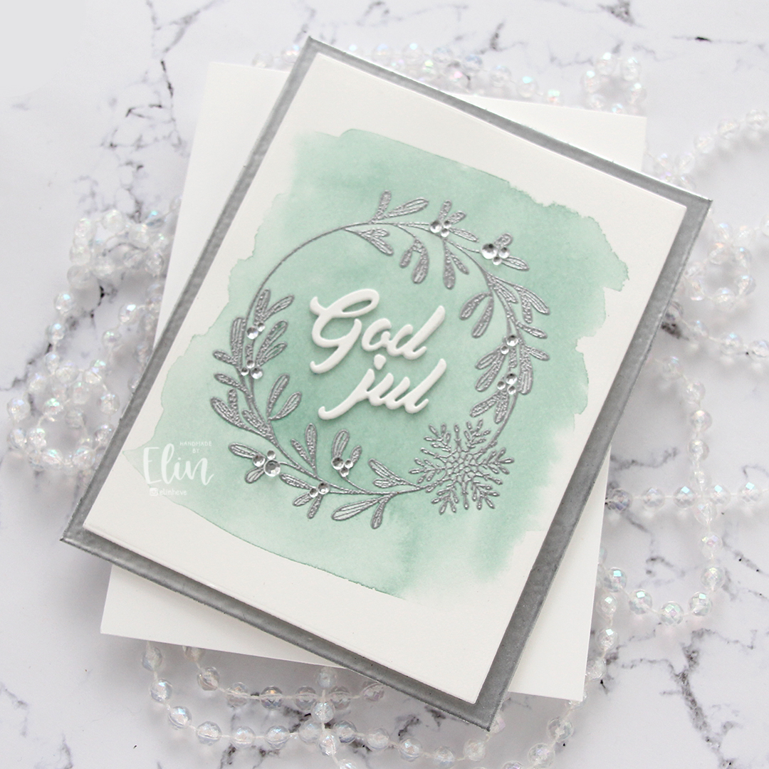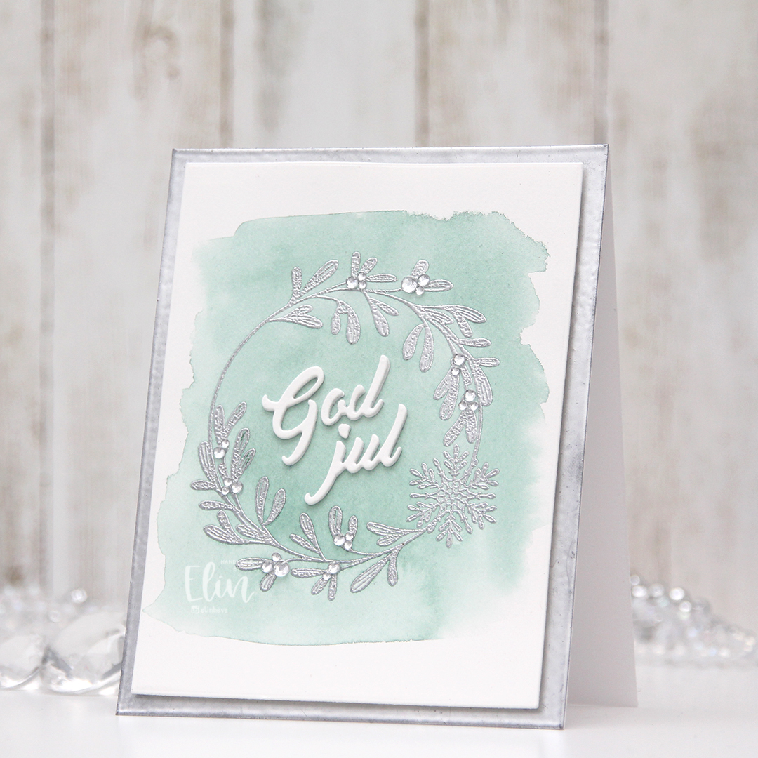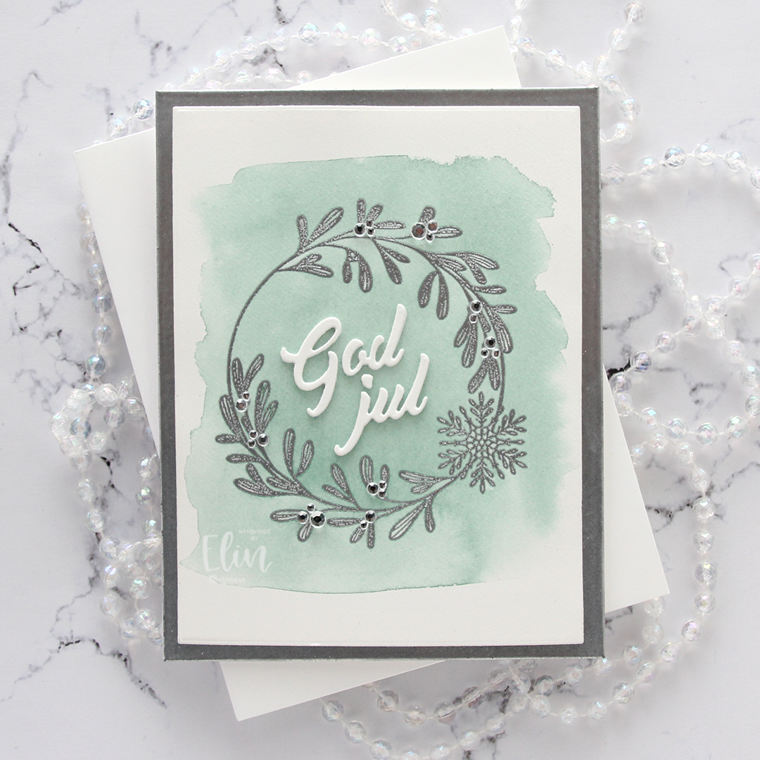 Using the Hjerte 3 die set from Papirdesign, I die cut the words God jul three times and stacked them for a dimensional look. I made sure to cut the top layer from the watercolor paper I’d already used so that the whites would match. I adhered my die cut words to the center of the wreath using liquid glue.
