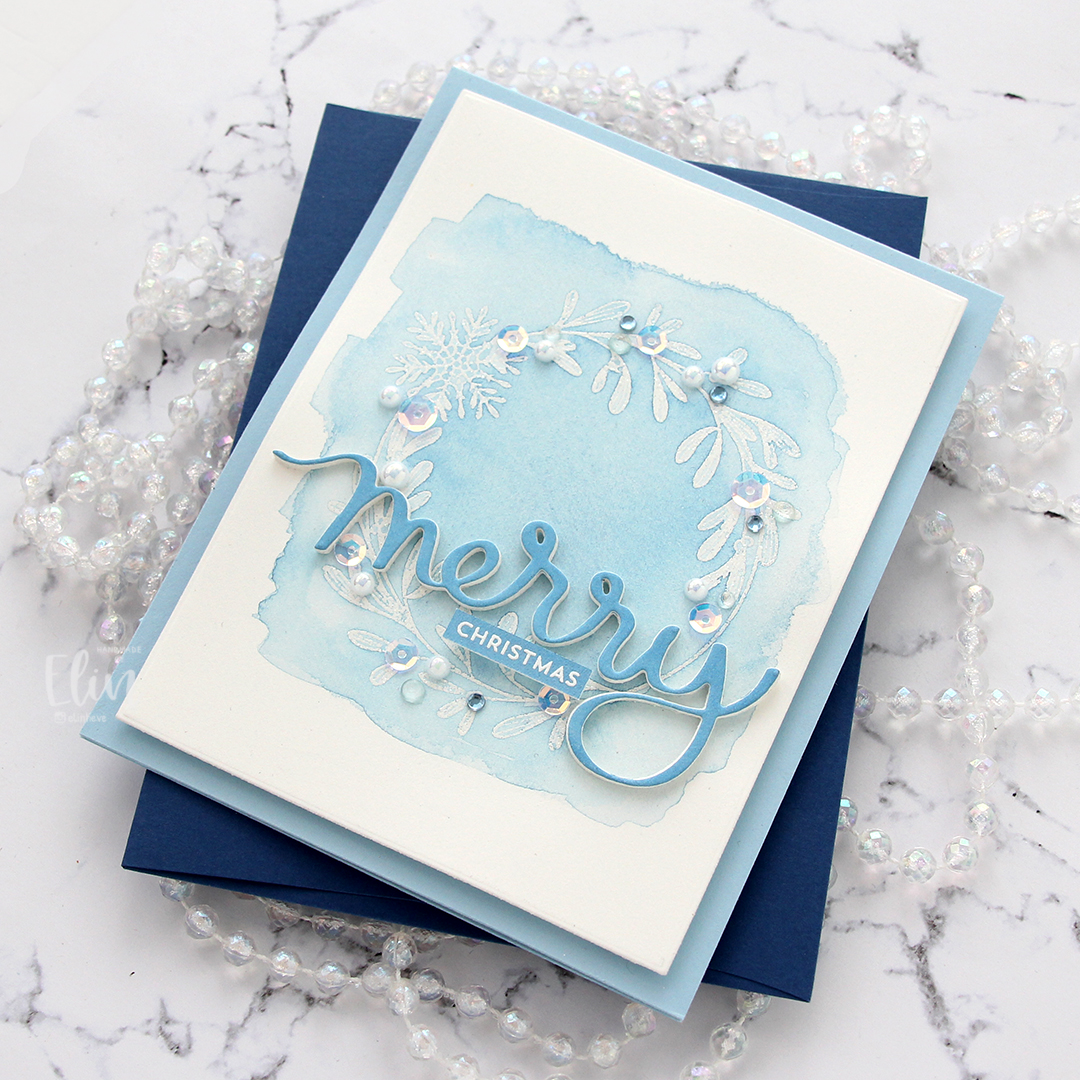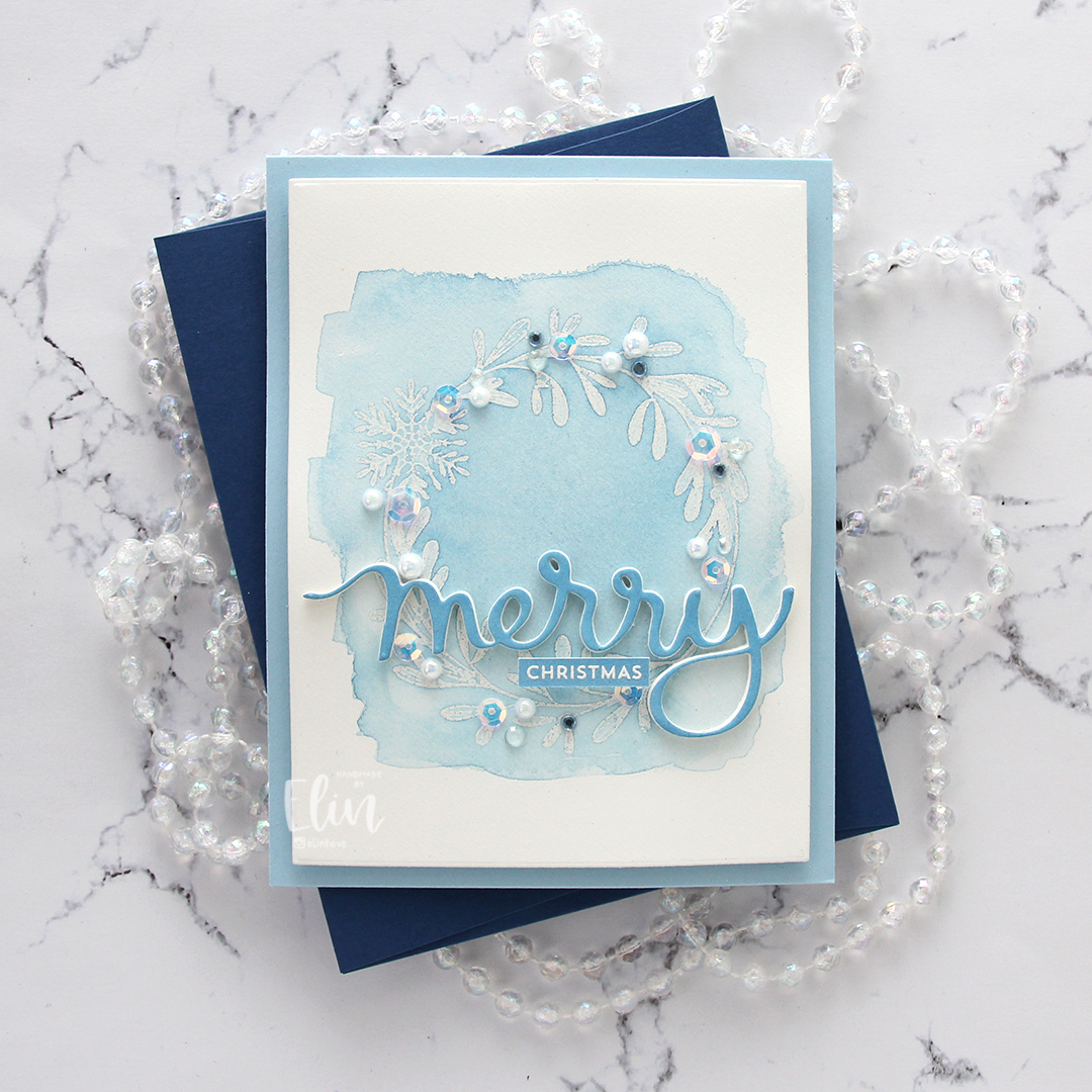 Using a more concentrated paint of the the same color, I did a flat wash on a scrap piece of watercolor paper that was big enough for me to die cut. I used the Merry Script die from Mama Elephant and die cut three layers of white and one layer from my painted blue piece and stacked them for dimension. I also white heat embossed part of a sentiment from the Itty Bitty Holiday stamp set from My Favorite Things and nestled that in below the merry using some clear foam tape.