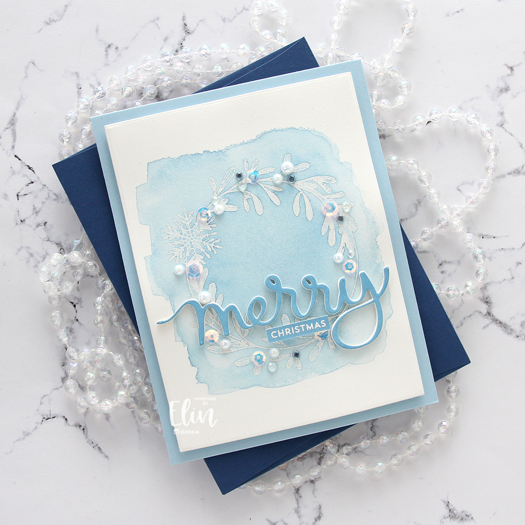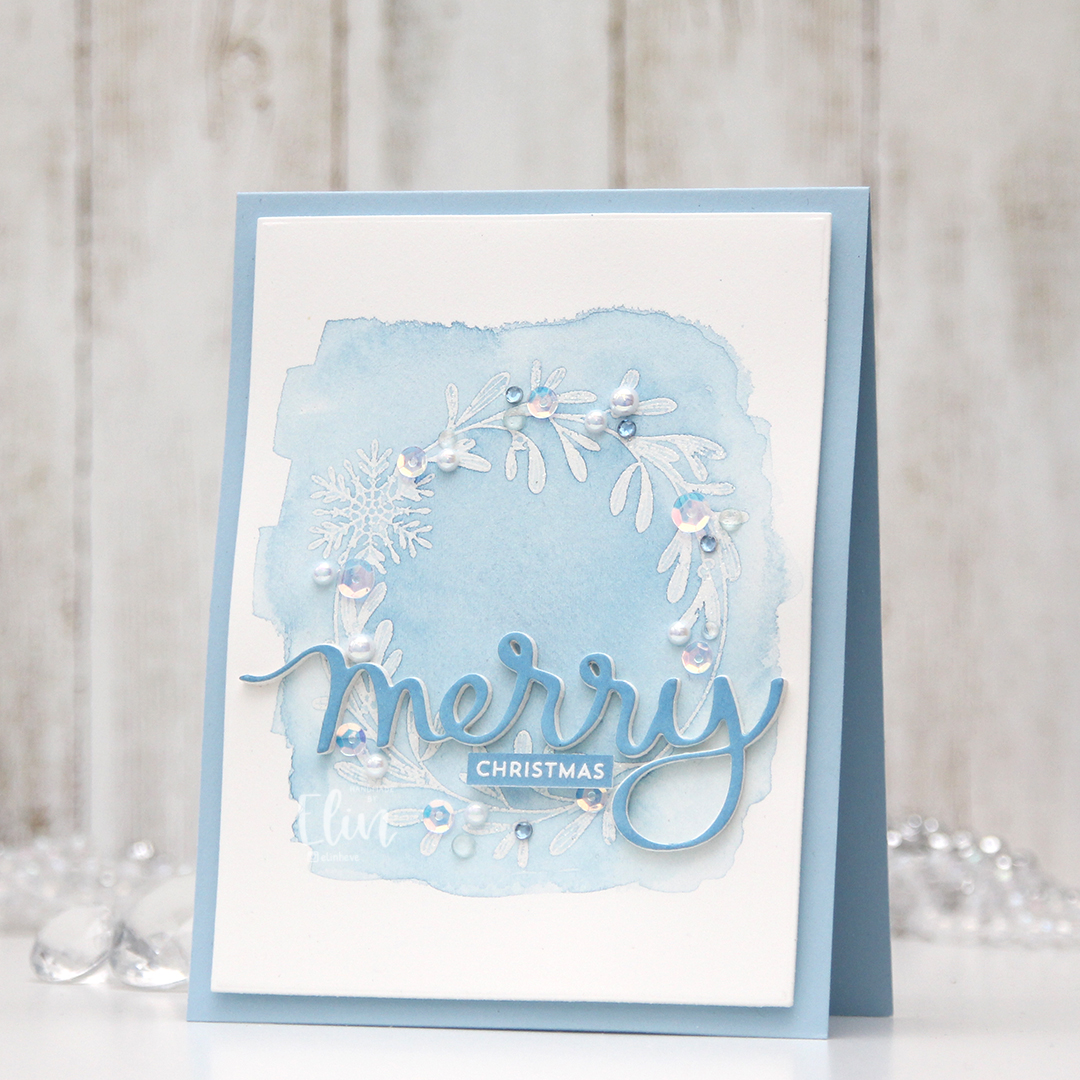 I used a die from Waffle Flower to create a rectangle from the watercolored piece and mounted in on foam tape on a card base I created from Spring Rain cardstock from Papertrey Ink. It’s no secret that I love blue for Christmas cards, and I thought this soft background with the wreath and the embellishments was a nice combo.