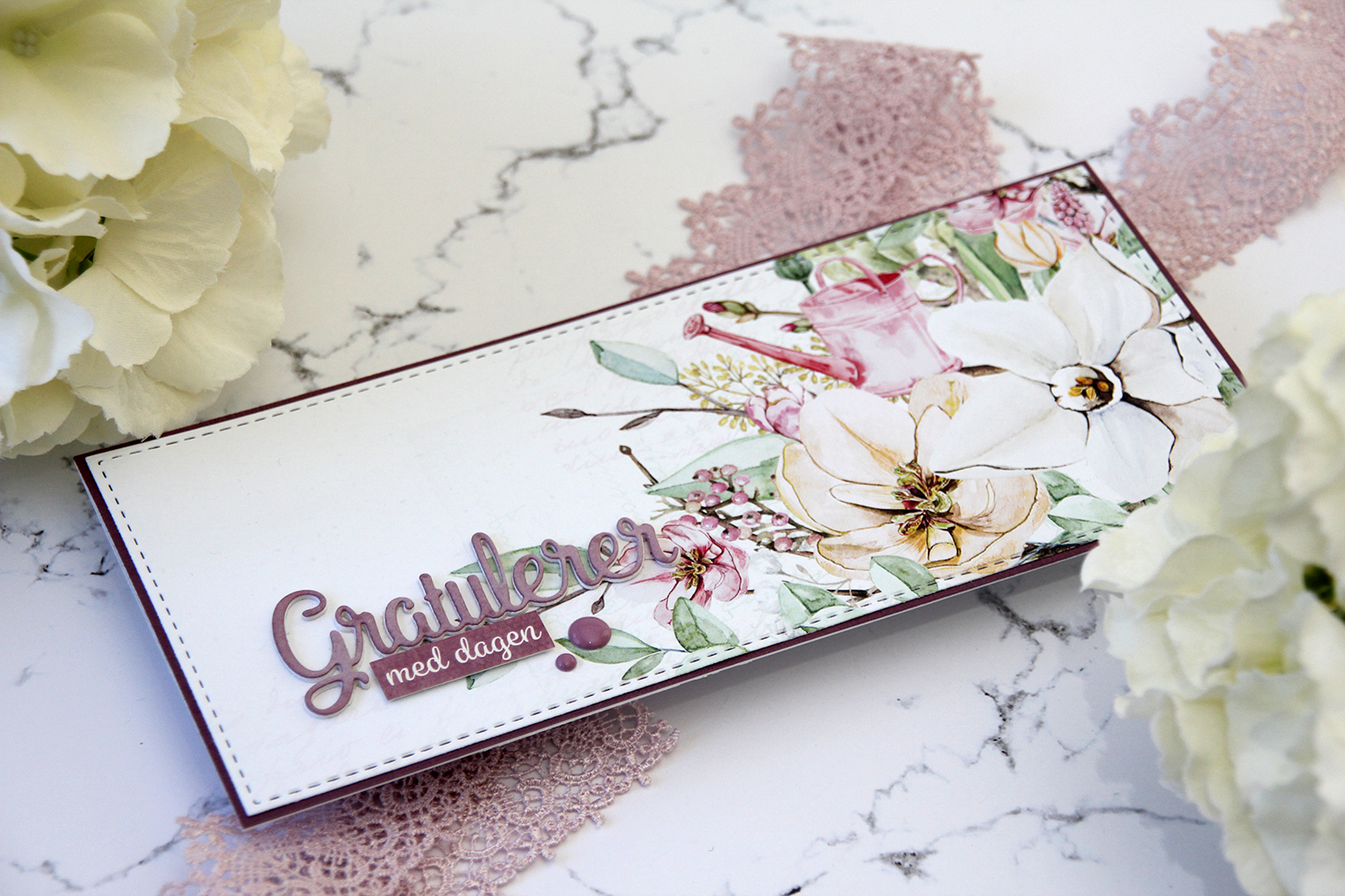 This first one might not even technically be a proper slimline card. It’s about 7-3/4 x 3-3/4″. I’ve used beautiful patterned paper from P13 for both my cards. I wanted the paper to be the hero, so I didn’t do too much to it. The sheet I used for this card is