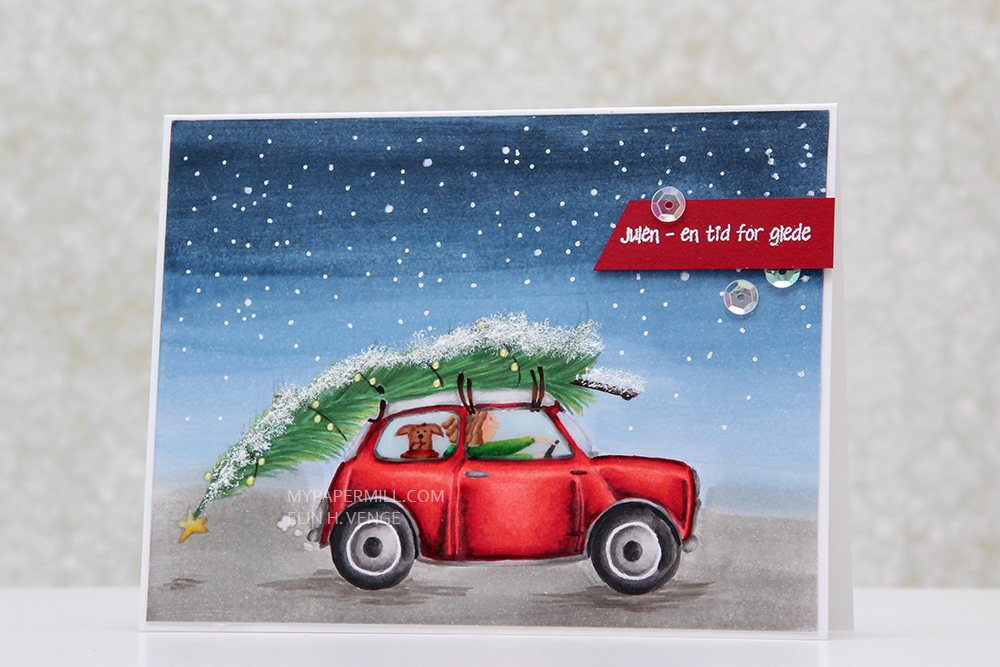Jeg har brukt nissestempelet fra Nisse med lykt-platen som hovedfokus på forsiden av kortet mitt. Jeg annengangsstemplet stempelet med Memento Summer Sky og fargela med nolinesteknikk med Copics. Jeg vet ikke helt om jeg vil anbefale annengangsstempling med akkurat det blekket, det ble nesten usynlig. Det er en veldig lys blåfarge i utgangspunktet, så førstegangsstempling hadde sikkert vært bra nok.