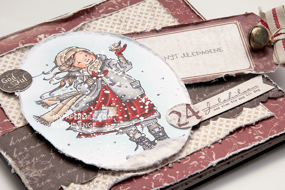 Bak motivet på forsiden har jeg gjemt en tag som jeg har stemplet en tekst fra Julehilsen-platen til Norsk Stempelblad på. I tagen har jeg festet et bånd og en bjelle som lager herlig julelyd.