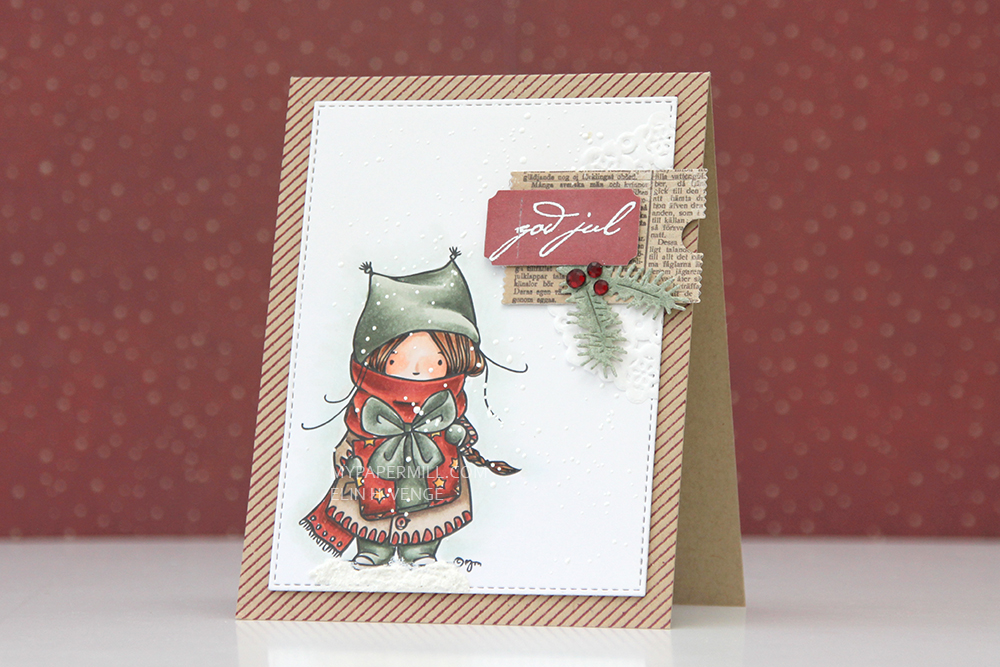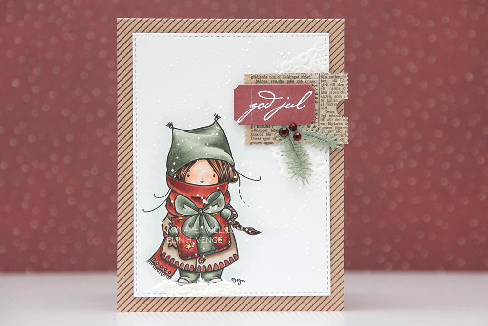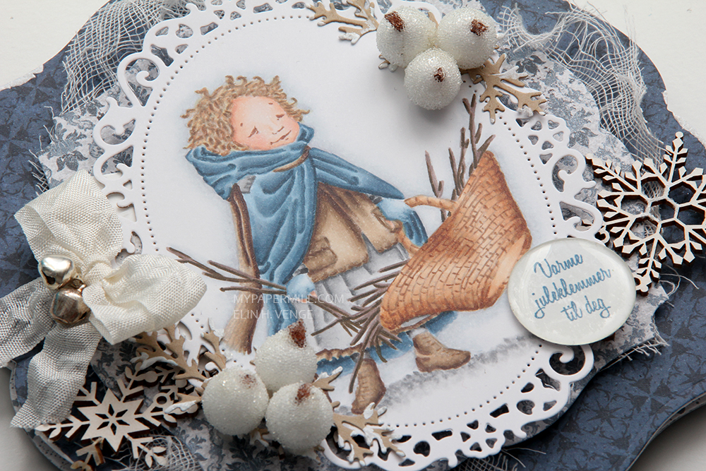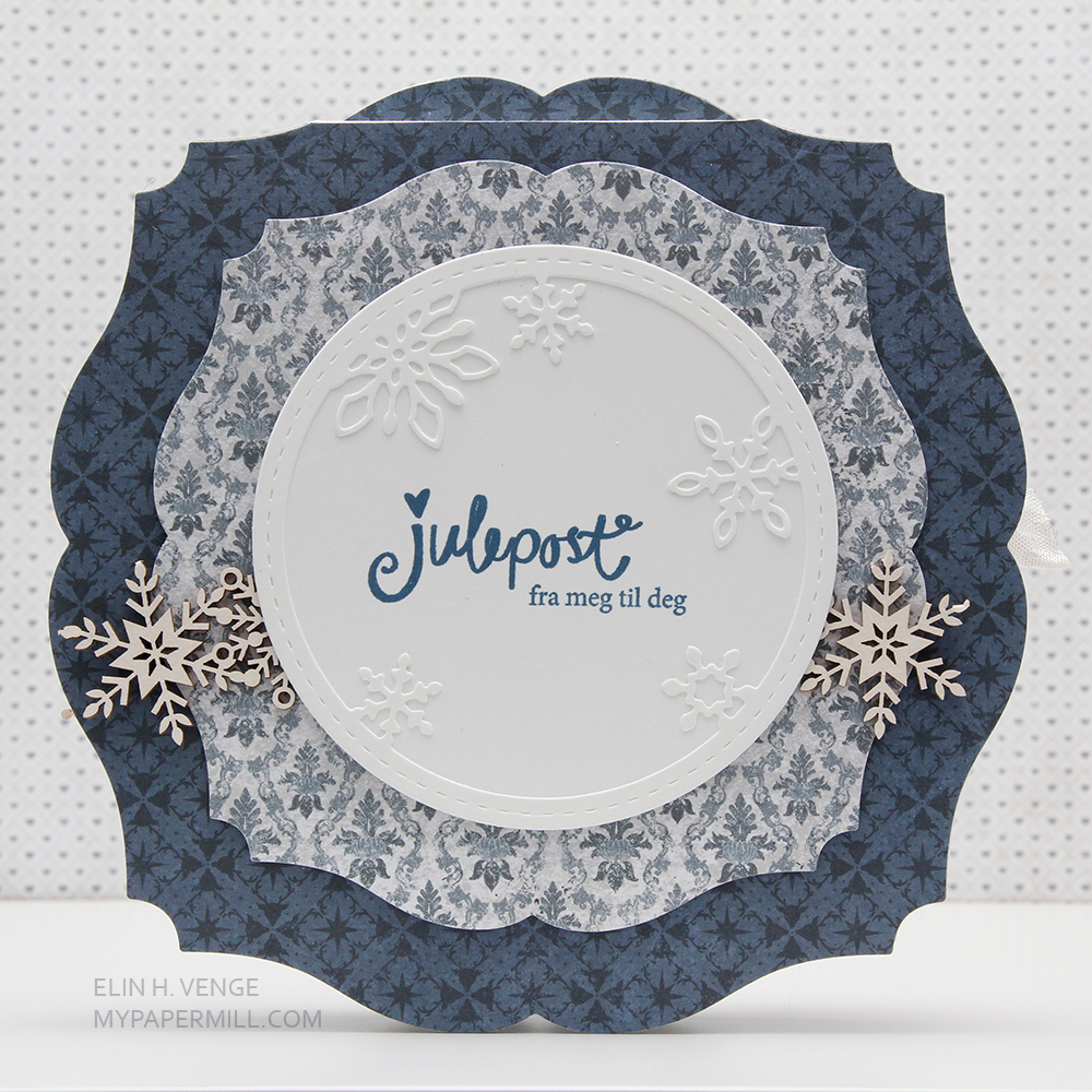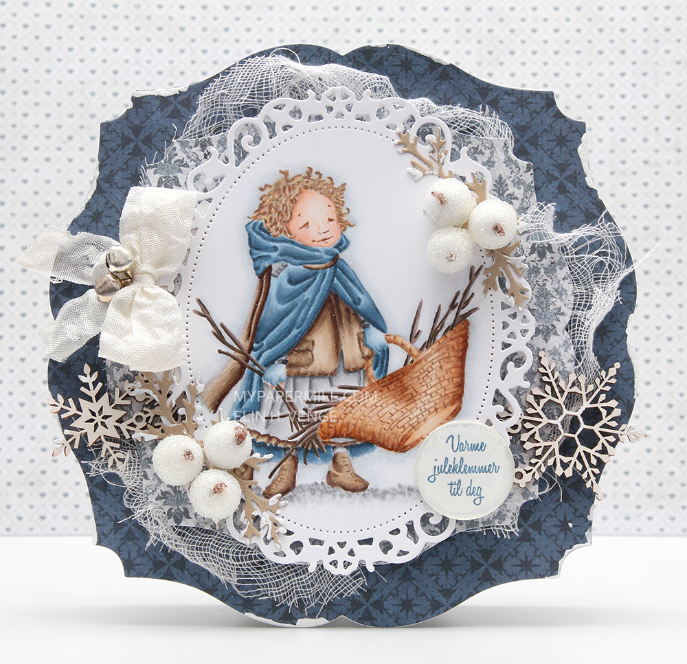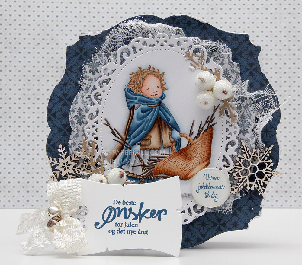 I printed my image with a very low opacity percentage and colored her with Copics. She’s diecut with a Spellbinders die, and the shape of the card itself is made using a Go Kreate die. I’m a huge fan of blue for Christmas cards, so the new papers from Papirdesign are perfect for me.