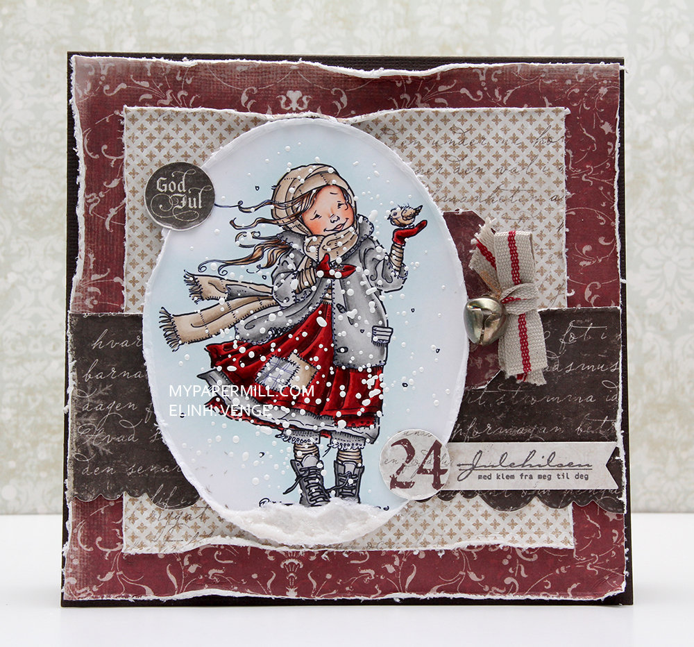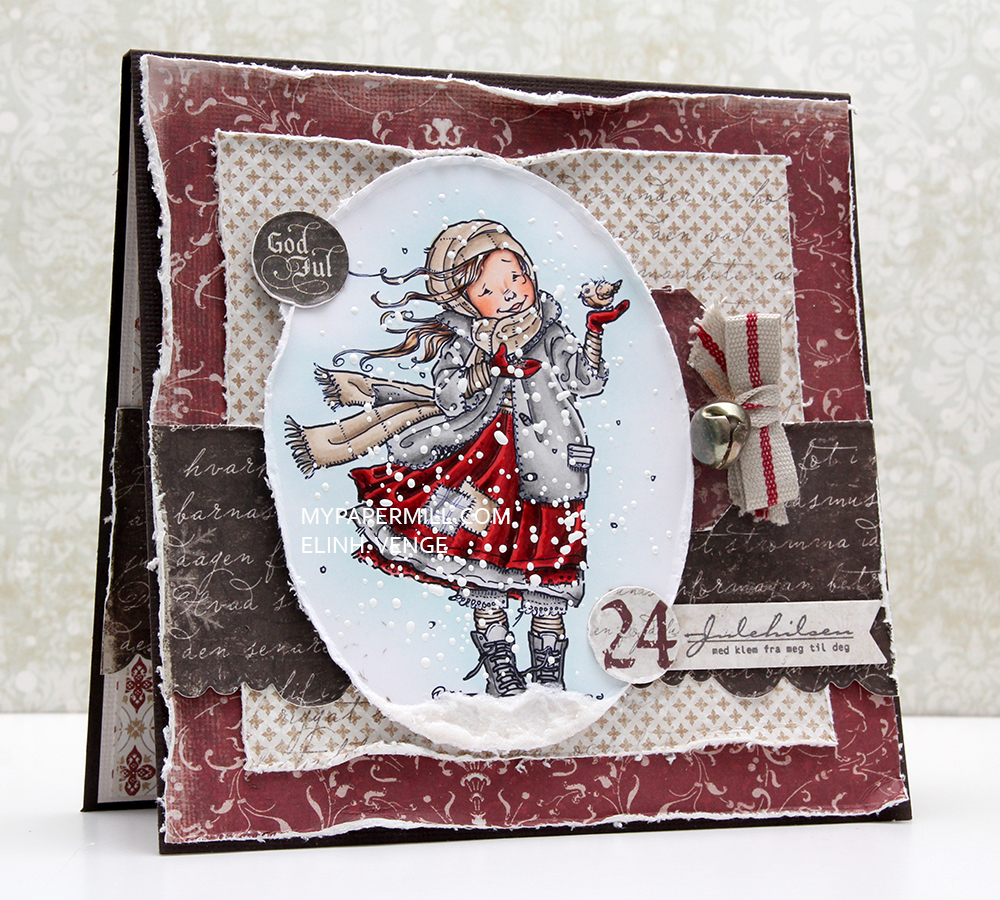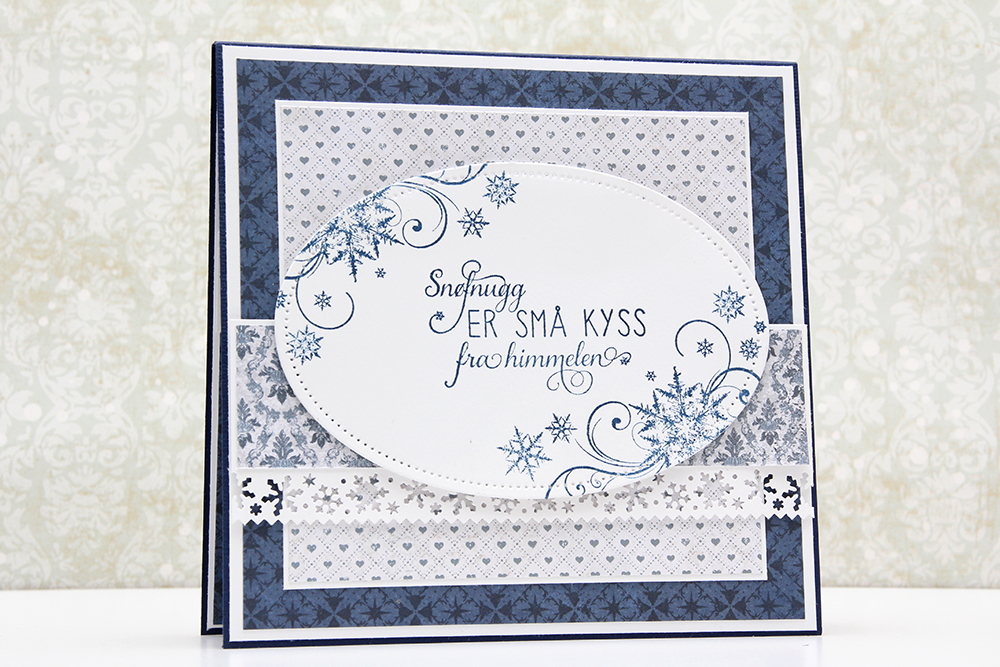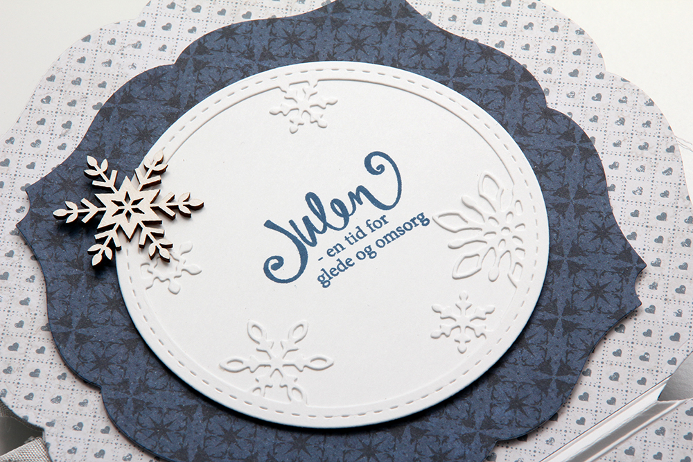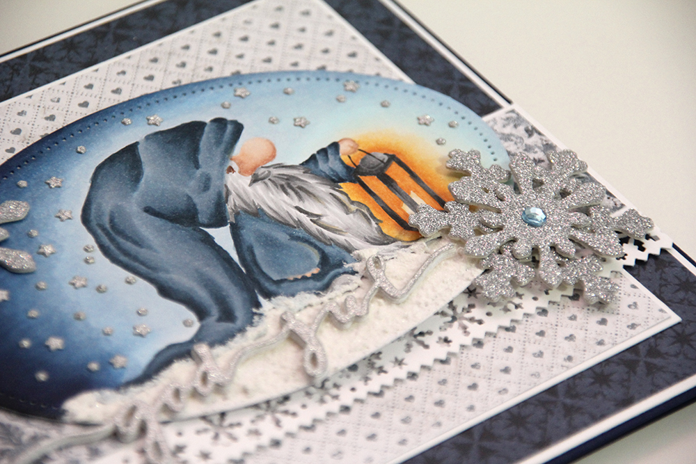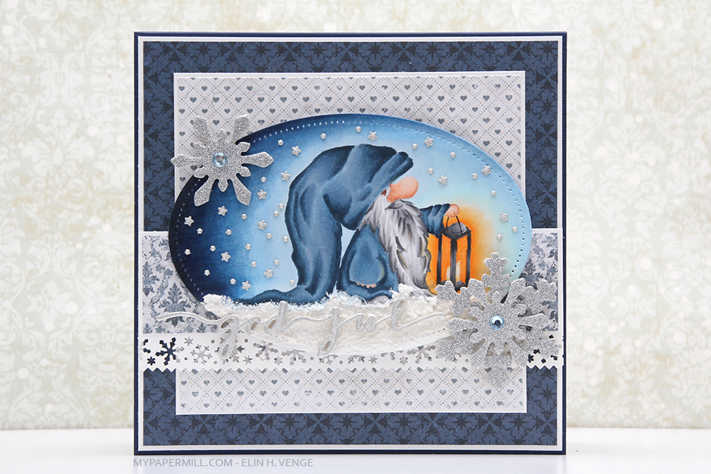 I printed my image with a very low opacity percentage and colored her with Copics. She’s diecut with a Spellbinders die, and the shape of the card itself is made using a Go Kreate die. I’m a huge fan of blue for Christmas cards, so the new papers from Papirdesign are perfect for me.