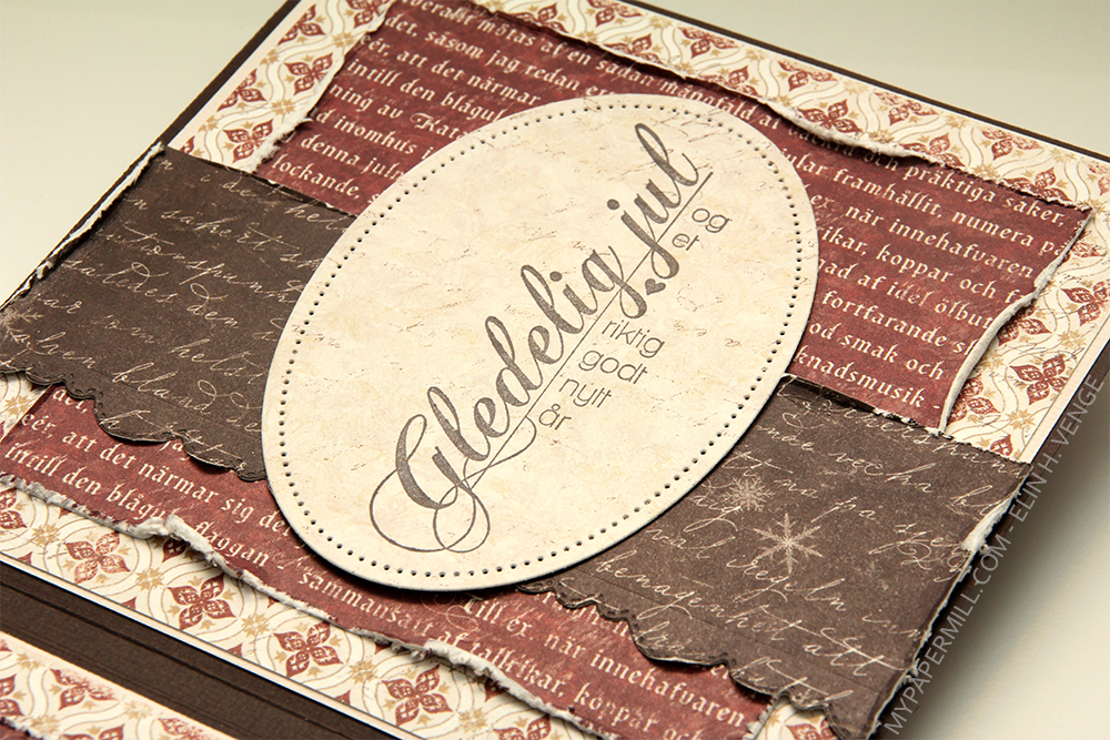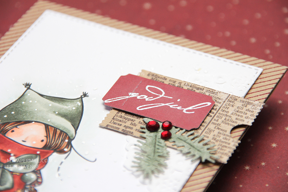 I’ve hidden a tag behind my image, diecut with an old Magnolia die. The sentiment is from Norsk Stempelblad AS, as are the rest of the sentiments on the card, all stamped using Papertrey Ink Enchanted Evening ink.