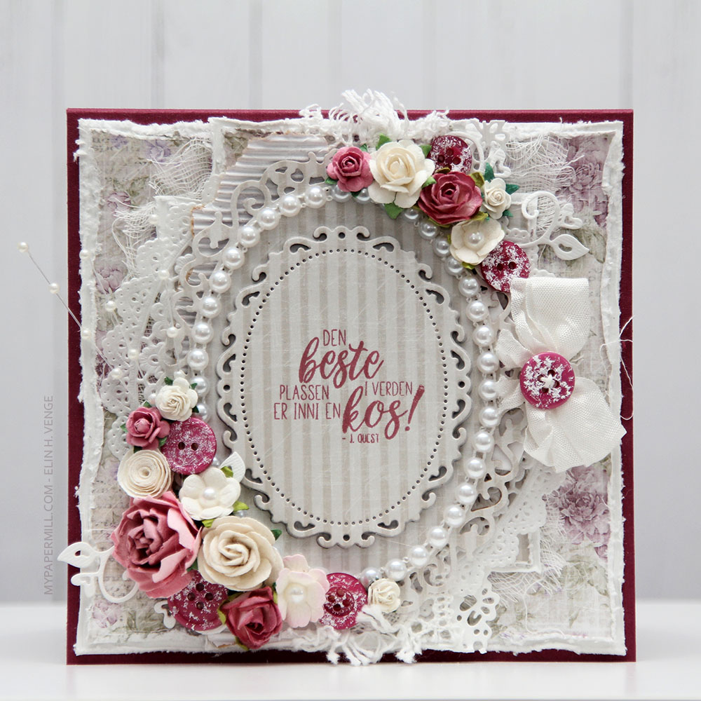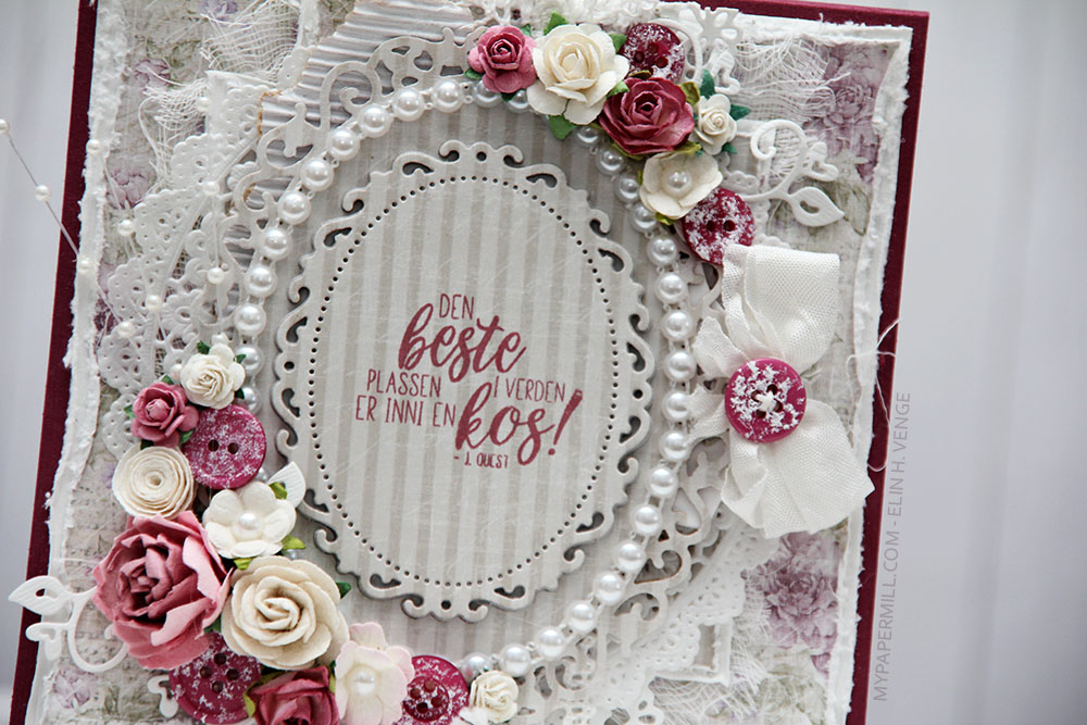 Kortet har jeg laget litt lag på lag. Jeg har brukt den samme rammen her som på vinskjuleren, og stemplet en tekst fra Norsk Stempelblad AS med Papertrey Ink Autumn Rose blekk rett på det ene mønsterarket. Jeg har pyntet enkelt med blomster og en perlestreng og lagt en tynn blonde bak som en slags ekstra ramme.