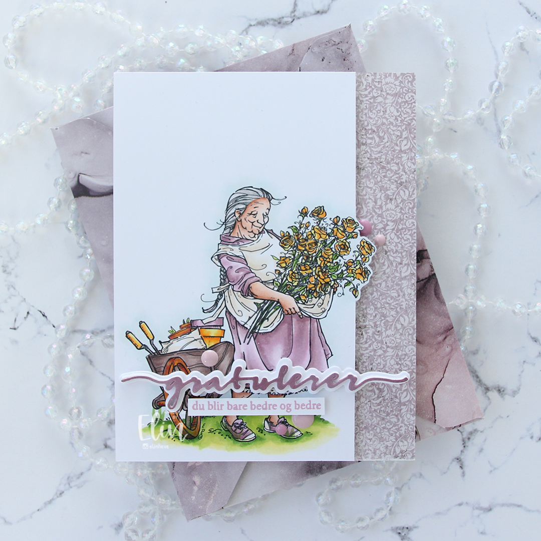 I die cut the Gratulerer 6 die from Papirdesign a few times. I die cut the shadow layer in white, then a few stacked of the word, before finishing off with a colored one. I actually colored this one with Copics on the scrap I cut off the panel. This is a neat trick if you want your colors to match, but don’t have the right cardstock color. I stamped a sentiment from the A06 stamp set from Norsk Stempelblad AS using Briar Rose ink from Concord & 9th, cut it down to a strip and adhered it below the die cut, adding a few strips of cardstock behind it for dimension. I finished off the card with a few enamel does from the Shades of Purple pack from Altenew.