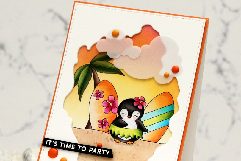 I created my little scene with the palm tree, a couple of surfboards and a penguin. I can never resist a penguin, and this one has a hula skirt – I was sold! I colored my scene with Copics, and the plan I had initially went out the window. I was going to color the base of the surfboards in a light yellow, almost white, but then I came up with this soft orange combo and totally changed everything else to fit. Instead of a soft blue sky, I ink blended a sunset using Honeysuckle, Clementine and Buttercup inks from Concord and 9th. I then used the largest die in the A2 Stitched Rectangle STAX 1 set from My Favorite Things, along with the Watercolor Wash Free Form die, also from MFT, to create a rectangular panel with a fun window. I die cut a couple more to stack behind the front panel to create a little bit of dimension, before adhering it all to my colored image.