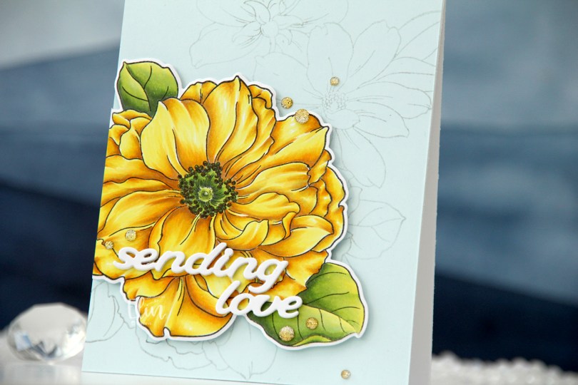 I popped up the flower on foam tape, added a layered sentiment I created using the coordinating die set and finished off with a few ombré glitter drops from Pinkfresh Studio.