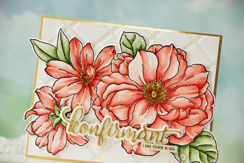 For the sentiment, I used a konfirmant die set from Papirdesign. I die cut the shadow layer from white cardstock and the word itself from the same gold cardstock that I used previously, with a few white die cuts stacked behind it for dimension. I even stacked a few behind the shadow, so it looks like the shadow floats on top of the flowers. For a sub sentiment, I used a sentiment sticker strip from Kort & Godt that I ink blended with Misty Sage ink from Altenew, before finishing off the card with a few Iridescent Dew Drops from Pinkfresh Studio.