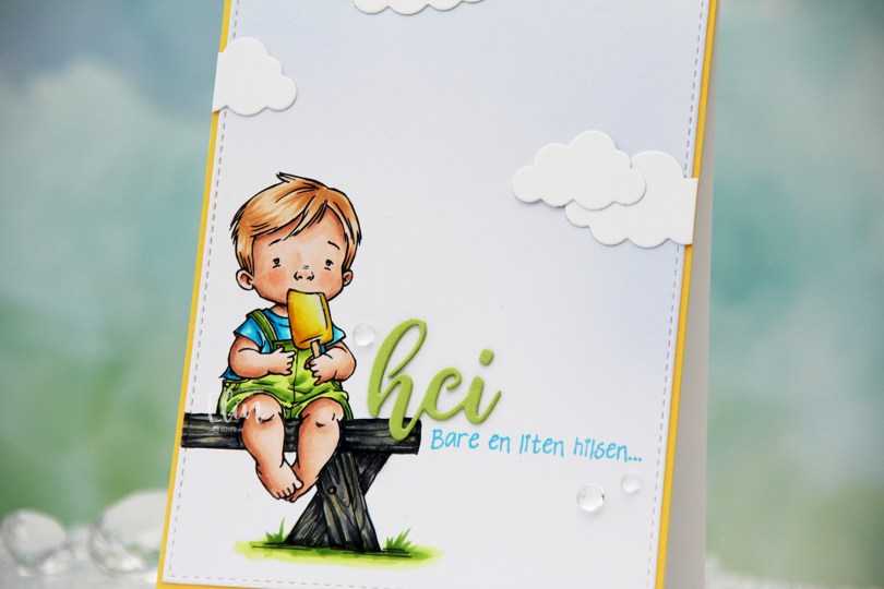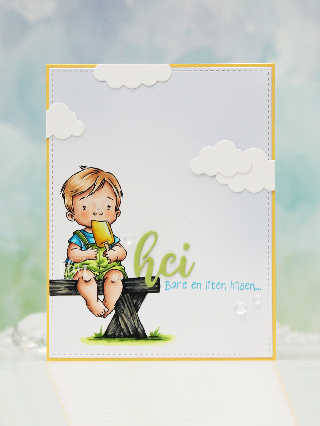 I stamped a sentiment from the Småtekster stamp set from Norsk Stempelblad AS next to the bench using Tide Blue ink from Altenew. I added my colored piece to a panel of Buttercup cardstock from Concord & 9th, which I then adhered to a top fold white card base. I die cut the word hei twice from Green Parakeet cardstock from Papertrey Ink, stacked them and adhered my double die cut next to the boy on the bench before adding a few die cut clouds and some dew drops. Both the cloud dies and dew drops are from Concord & 9th.