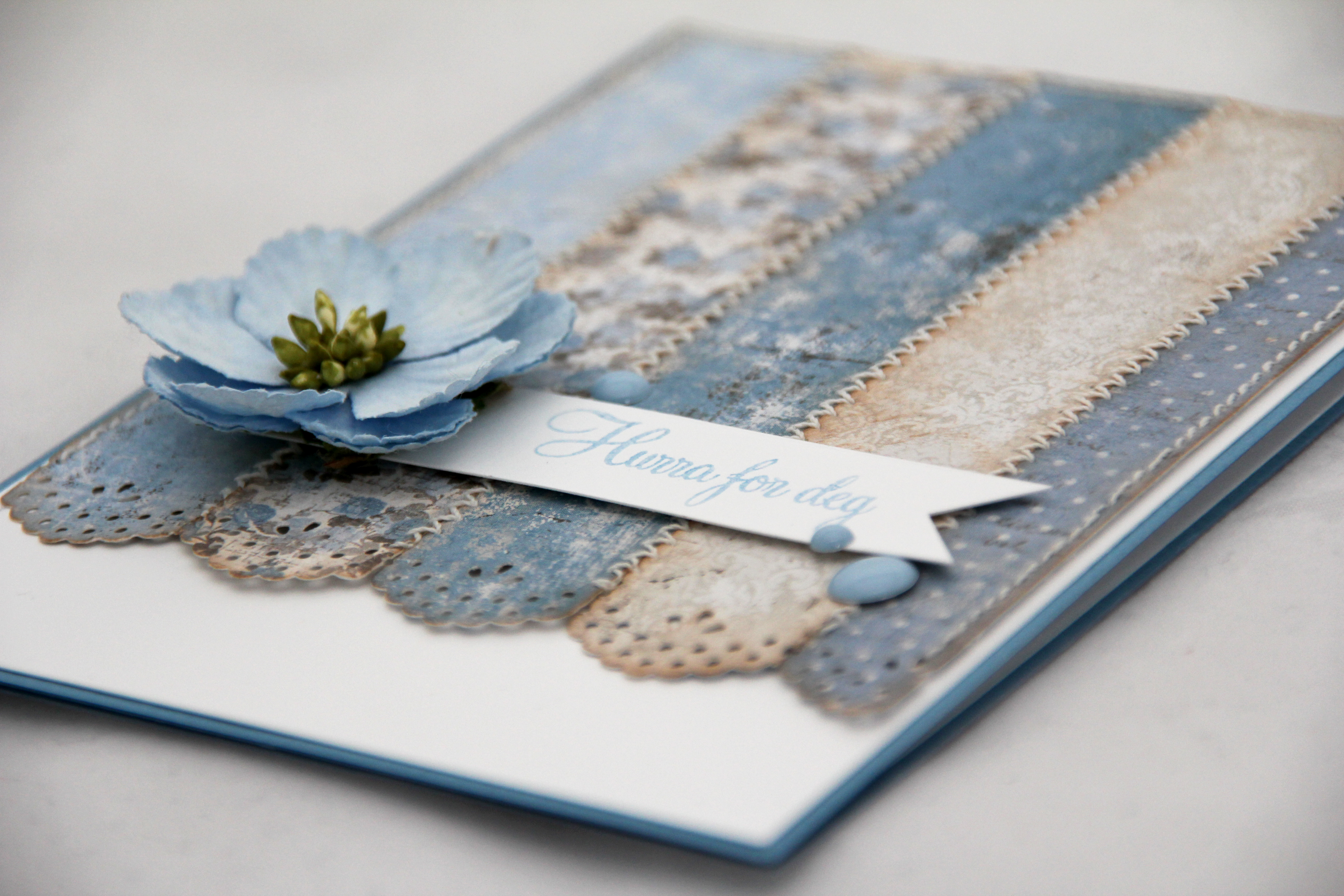 Jeg valgte å lage et staffelikort denne gangen. Jeg har tatt en dypdykk i gamle ark og fant frem Anno 1939, Minnenas Melodi, Korrespondens og Eviga ögonblick, alle fra Förgät Mig Ej-serien til Pion Design. I tillegg har jeg brukt The Courts fra Romantique-serien til Prima og en liten rest fra et mønsterark fra 3ndypapir. Andre eldgamle ting jeg har brukt er brune fløyelshortensiaer fra Petaloo og en ramme fra Tattered Angels. Den er svertet med Distress Ink Vintage Photo, det samme er alle øvrige kanter, som også er rufset. På stopperpanelet har jeg stemplet et bursdagsstempel fra Norsk Stempelblad AS og et splashstempel fra Inkido, i tillegg til at jeg har satt på noen frimerker fra Pion-arkene.