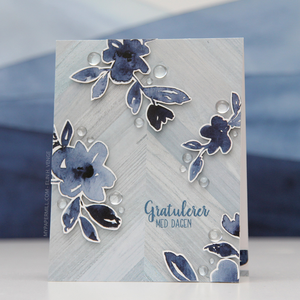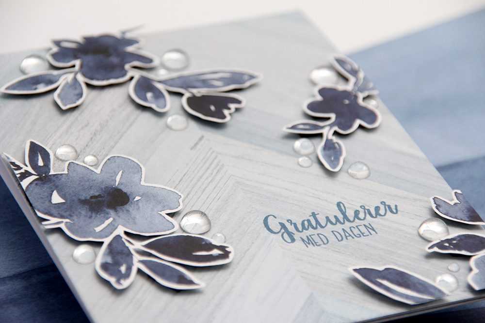 Til slutt limte jeg på raindrops fra Little Things from Lucy’s Cards i forskjellige størrelser rundt blomstene mine. Vanligvis setter jeg småpynt som dette rundt teksten, to under og en over, men her har jeg fokusert på blomstene istedenfor. Pynten gjør at øynene dras mot blomstene, og gratulerer-teksten blir mer som et bakgrunnselement.