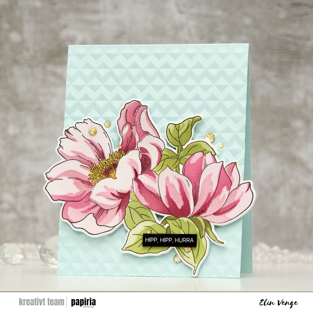 I adhered all my flowers and leaves with liquid glue, stacking the pieces in the background for strength and dimension. They’re only attached at the base of the sprigs, so they have som lift at the tips. I die cut a sentiment die from Kort & Godt four times from Harbor cardstock, stacked them, added a vellum shadow layer behind and glued my sentiment on top of the larger flower, before finishing off with a few champagne glitter drops from Pinkfresh Studio.