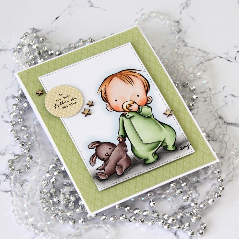I’m doing my best to make my pile of patterned paper scraps shrink and not grow. My biggest problem with that is that most of my cards are fairly simple without a lot of patterned paper, and my scrap pile feels endless. Still I keep chipping away at it, hoping it’ll be visibly smaller one of these days. For this card I used an old green scrap from Pion Design and a yellow one from Papirdesign. I diecut both, the green using the largest of the stitched rectangle dies from My Favorite Things, and the yellow one using a super old Quickutz die.
