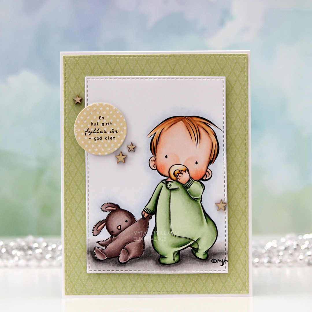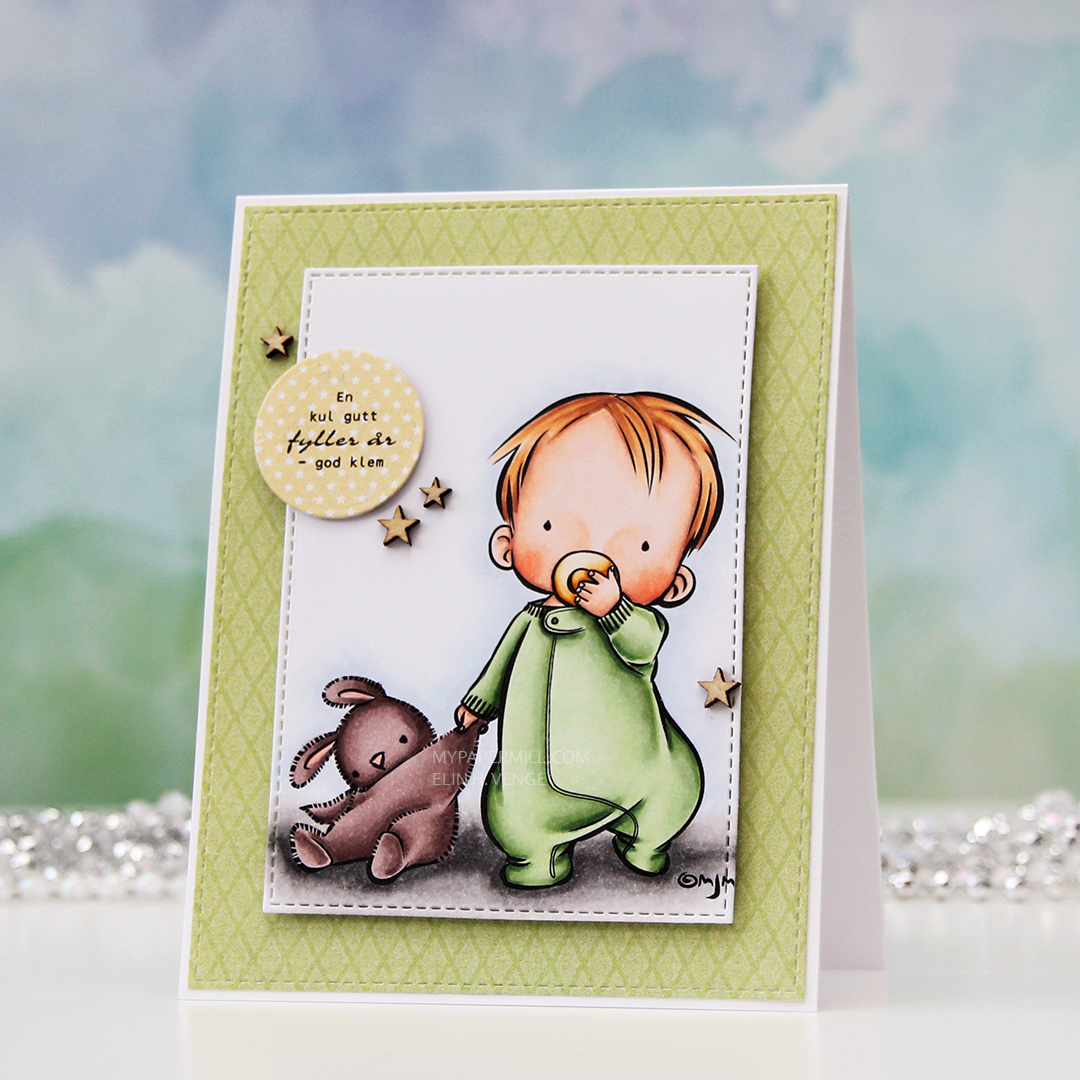 I also diecut the image using a smaller stitched rectangle die from MFT, and popped the panel up on foam tape centered on my card. I used some 1 mm foam squares to adhere my circle diecut with a stamped sentiment from Norsk Stempelblad AS.