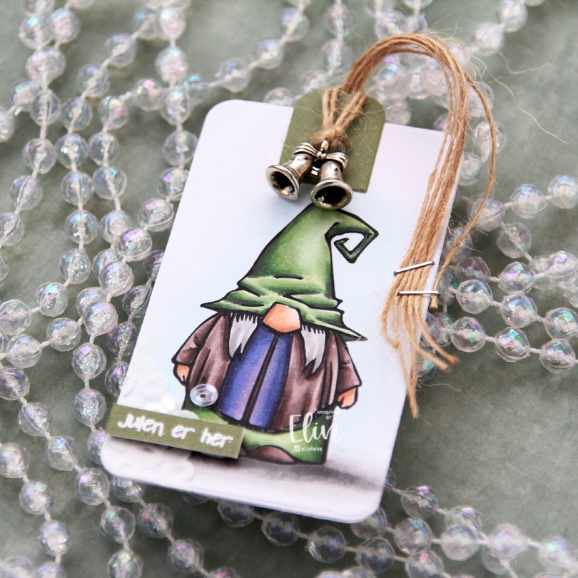I colored the gnome (his name’s Alf, you can find him here) with my Copics and used the Fold-up Tags die set from My Favorite Things to turn him into a quick gift tag. I die cut the reinforcer from green patterned paper from an old collection from Pion Design, and used a piece of cardstock from the same collection to stamp and white heat emboss a sentiment onto.