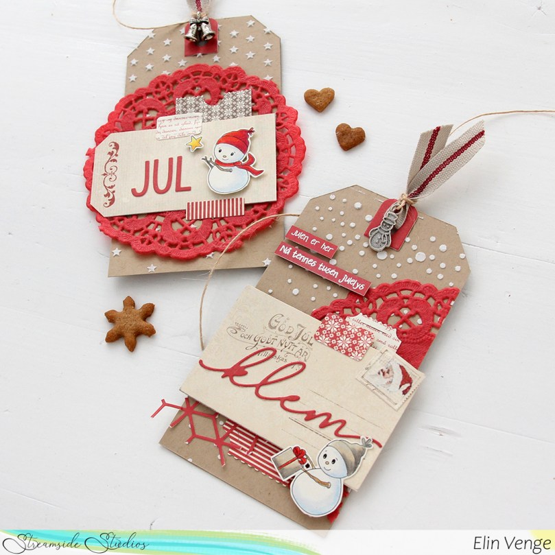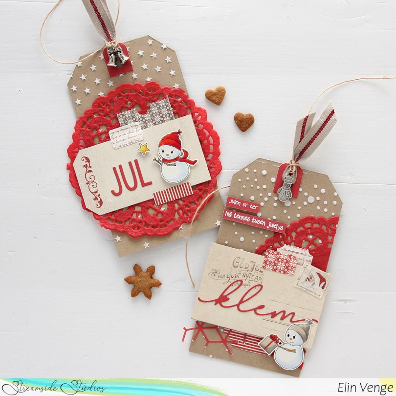 A lot of elements are the same on these two tags as the first two; patterned paper from Pion Design die cut using the Happy Days Ticket Stubs die from XCut. I also used the same die from Altenew that I used with the green cardstock on this one, and it’s a nice added element that doesn’t have the perpendicular angles than many of the other layers do, so it breaks up the monotony a little and adds interest. For the tag with the stars, I used the word JUL from the Gledelig jul die from Kort & Godt, and for the tag with the Christmas present, I used the word klem from the Juleklem die, also from Kort & Godt. I added red paper doilies from Papirdesign to the base of these tags, it’s a nice foundation to put everything else on top of.