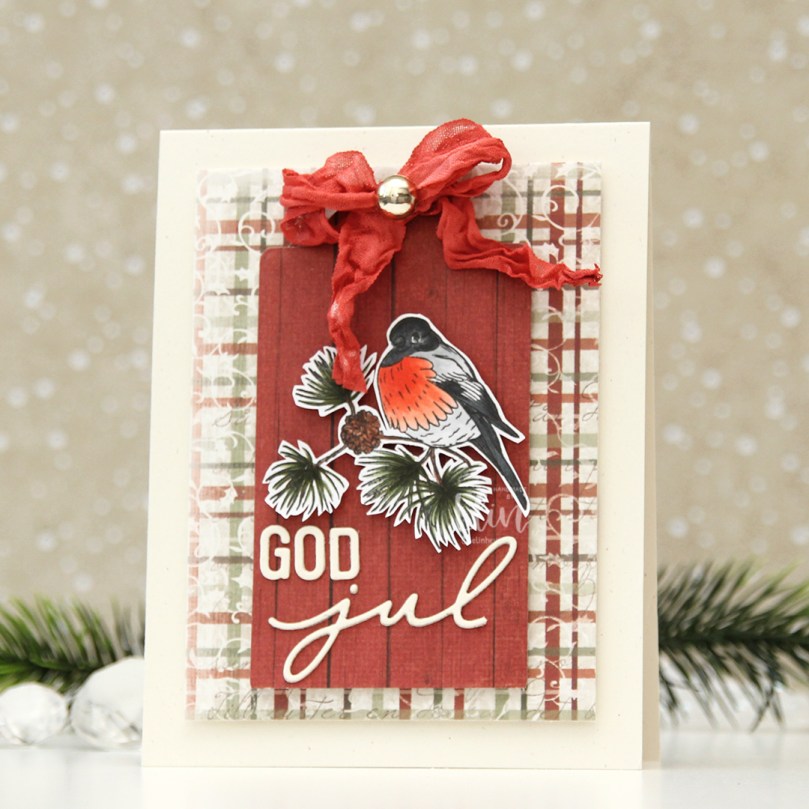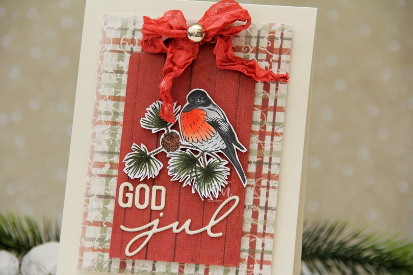 I used a die to create the word jul. The die actually cuts the word juleklem, but I only needed jul for my card and cut the other part off. Using an alphabet die, I die cut the letters to spell god and glued them above jul to complete my sentiment. I added the bullfinch image using foam squares and also added a big gold pearl to the knot on the bow for a little bit of shine to finish my card.