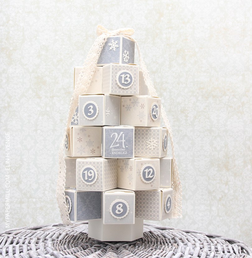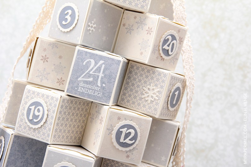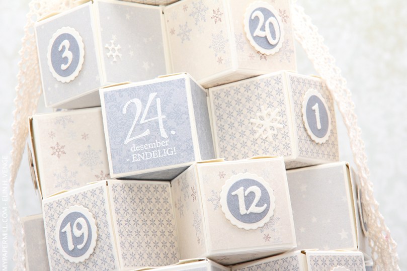 Jeg har stanset ut tallene mine med dies fra KaBoks. Alle tallene er dekket med distressglitter. Det vises dessverre ikke så godt på bildene, men gir en herlig frostet effekt i virkeligheten. Samtlige tall er limt på sirkler av mønsterark, som igjen er limt på scallopsirkler i kartong og proppet opp fra fronten av hver lille eske.