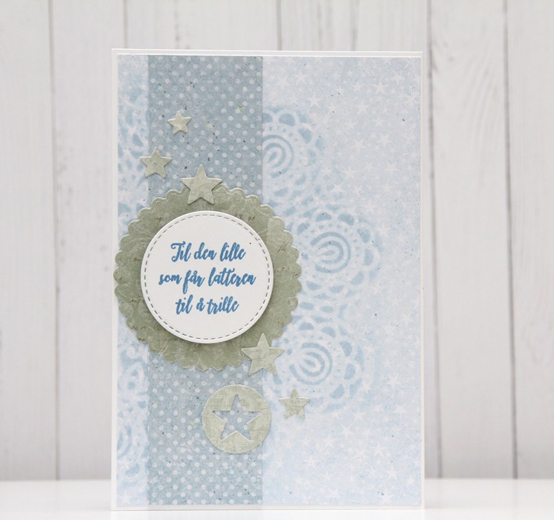 Et kort med relativ få elementer, men det trenger ikke å være kjedelig av den grunn. Jeg har brukt en stensil fra Simon Says Stamp sammen med embossingpaste og embossingpulver på bakgrunnen for å pynte opp det lyseblå mønsterarket med stjernene litt.