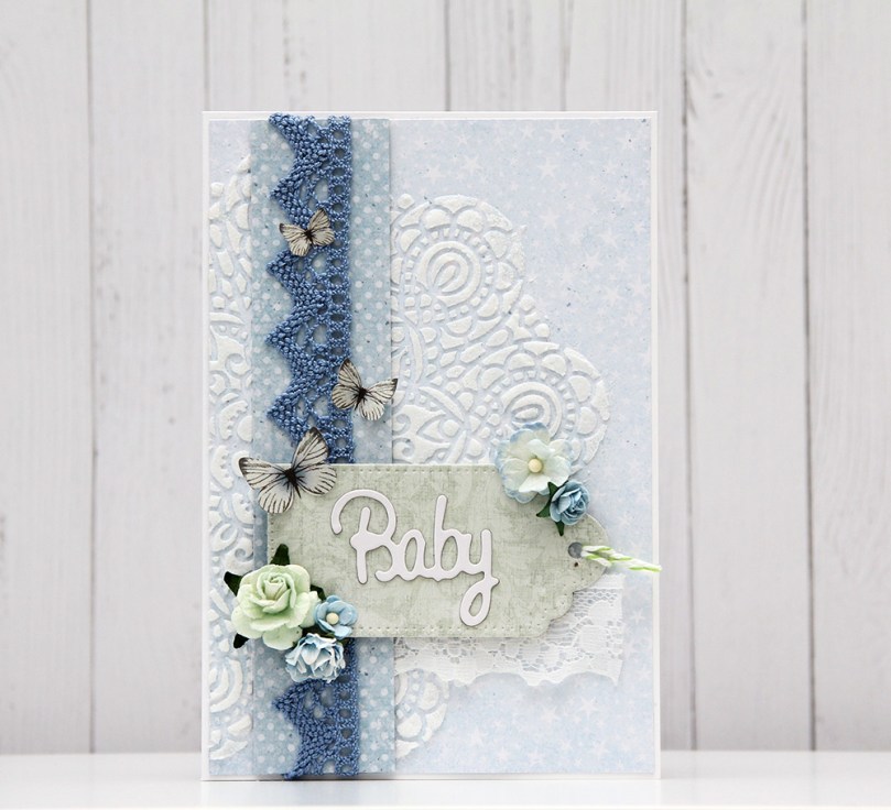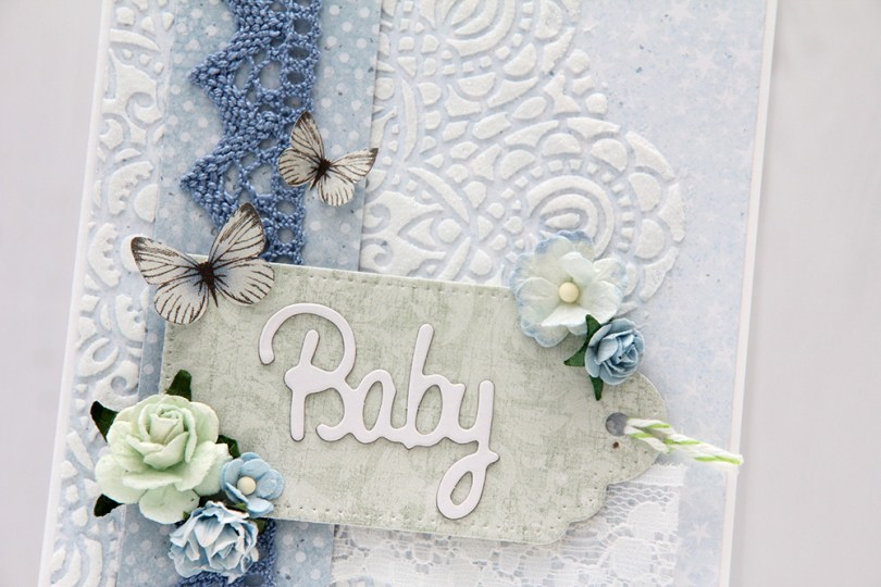 Jeg stanset ut en tag fra en rest av et grønt mønsterark fra Maja Design. Den er montert med 3D-teip for å få litt mer dimensjon før jeg pyntet med diverse blomster og noen sommerfugler klippet ut av mønsterark fra Pion Design. Det hvite Babyordet er tynn chipboard fra Papirdesign.