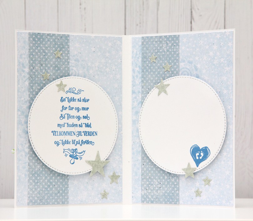 På innsidene har jeg gjort det meget enkelt. Jeg har brukt den samme stensilen også her, men istedenfor embossingpaste har jeg brukt Spring Rain blekk fra Papertrey Ink til å sverte med. Jeg har stemplet en tekst fra Papirdesign på venstresiden, og det lille hjertet med føttene er også et stempel fra Papirdesign. Begge er stemplet med Blueberry Sky blekk fra Papertrey Ink, og de runde panelene er stanset ut med en die fra My Favorite Things og så satt på 3D-teip. De grønne stjernene er stanset ut med en Papirdesign-die.