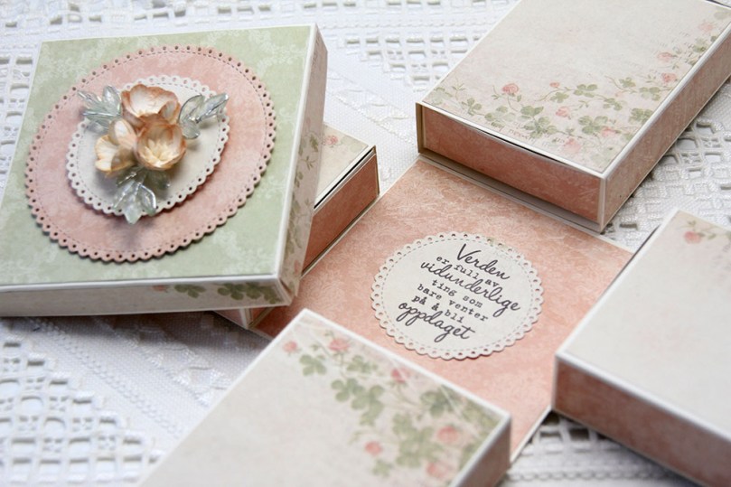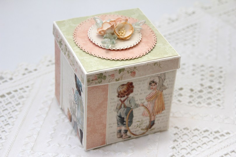 Jeg brukte rester fra en gammel serie fra Pion Design til å kle eksplosjonsesken min. Serien er Grandma’s School Book, og jeg brukte dies fra Cottage Cutz til å lage sirklene på toppen, og pyntet enkelt med kirsebærblomster fra Papirdesign og pyntegrener fra Kort & Godt.