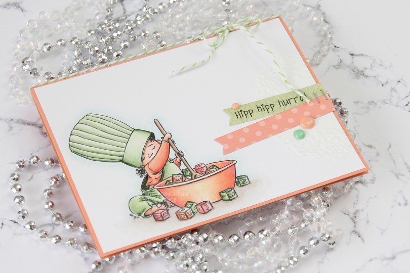 I printed my image onto X-Press It blending card towards the bottom left corner of a quarter sheet. I colored it in with my Copics, before trimming it down to 5 3/8 x 4 1/8″. I wanted the Melon Berry cardbase from Papertrey Ink to show around the edges, and this size panel creates the perfect 1/16″ border on all four sides.