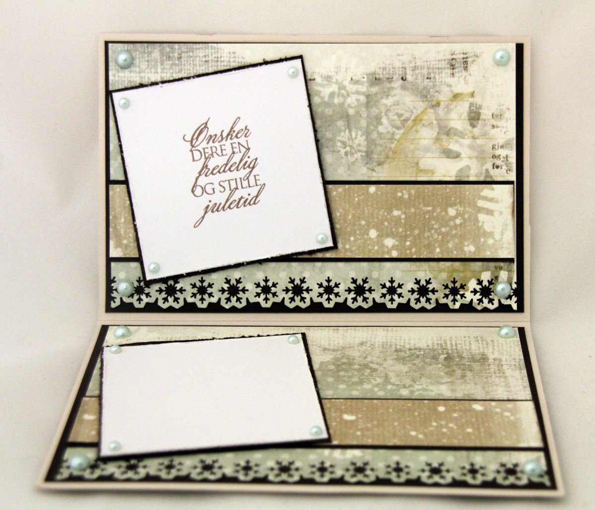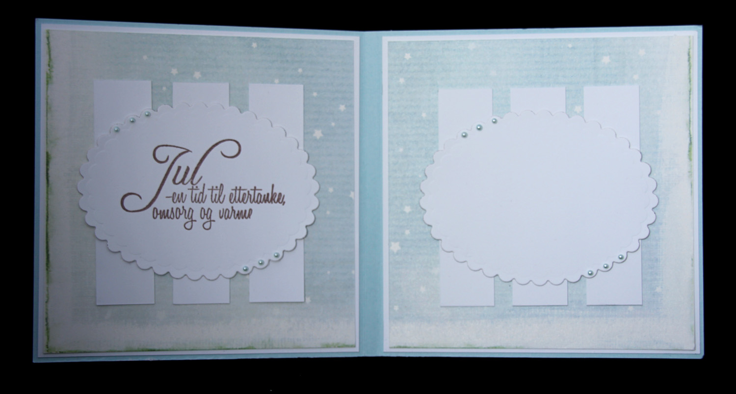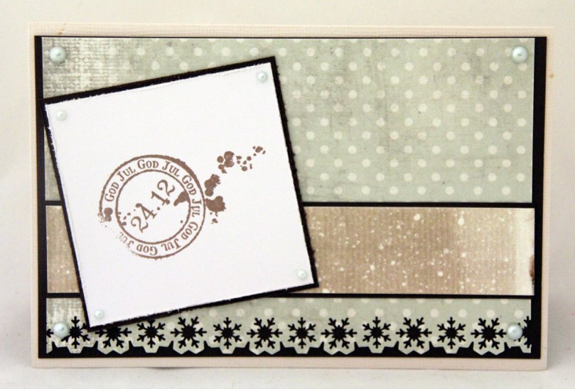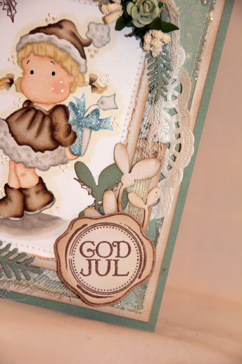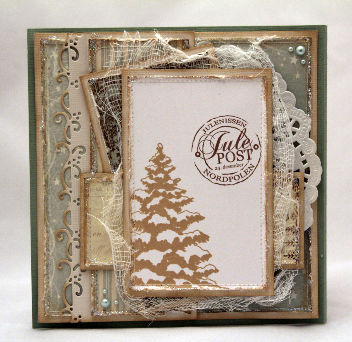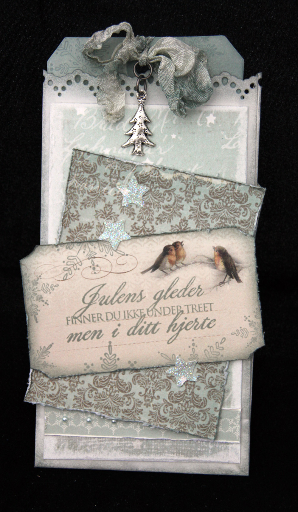 En annen ting som er genialt med posekort er at man får brukt rester. Jeg bruker stort sett så mye materialer på mine kort at det ikke blir supermasse rester igjen (er det sant??), men det er uansett fint å bruke rester til dette formålet. På dette kortet har jeg brukt “Ventetid” fra Poppydesigns Juledrømmer-kolleksjon, og arket “Juldikt” fra Pion Designs Väntan på tomten II-kolleksjon. Fra Pion Design har jeg også brukt “Klippark” og “Tagsark”, samt “Bårder”. Stjernene jeg har punchet ut har fått et lag med stickles star dust, juletrecharmen kommer fra Kort og Godt.