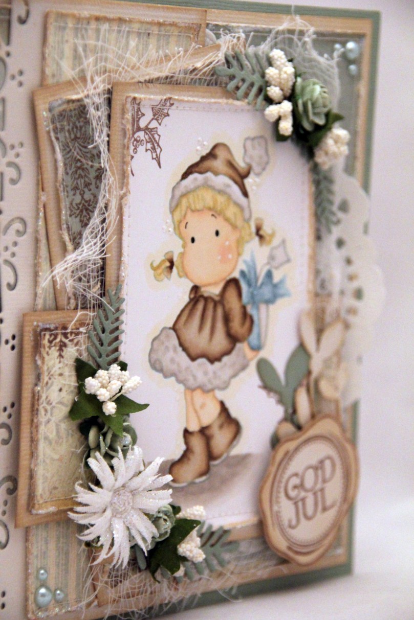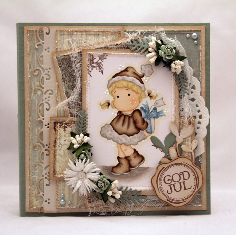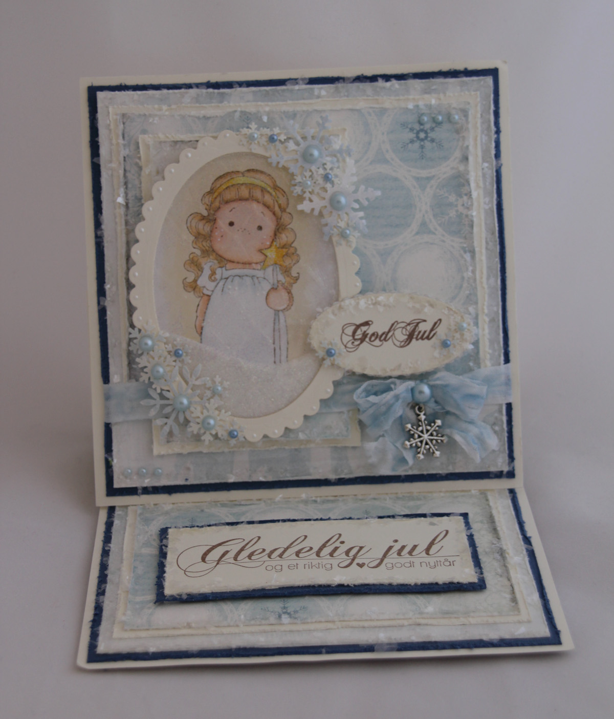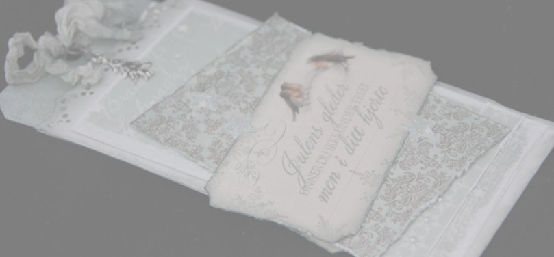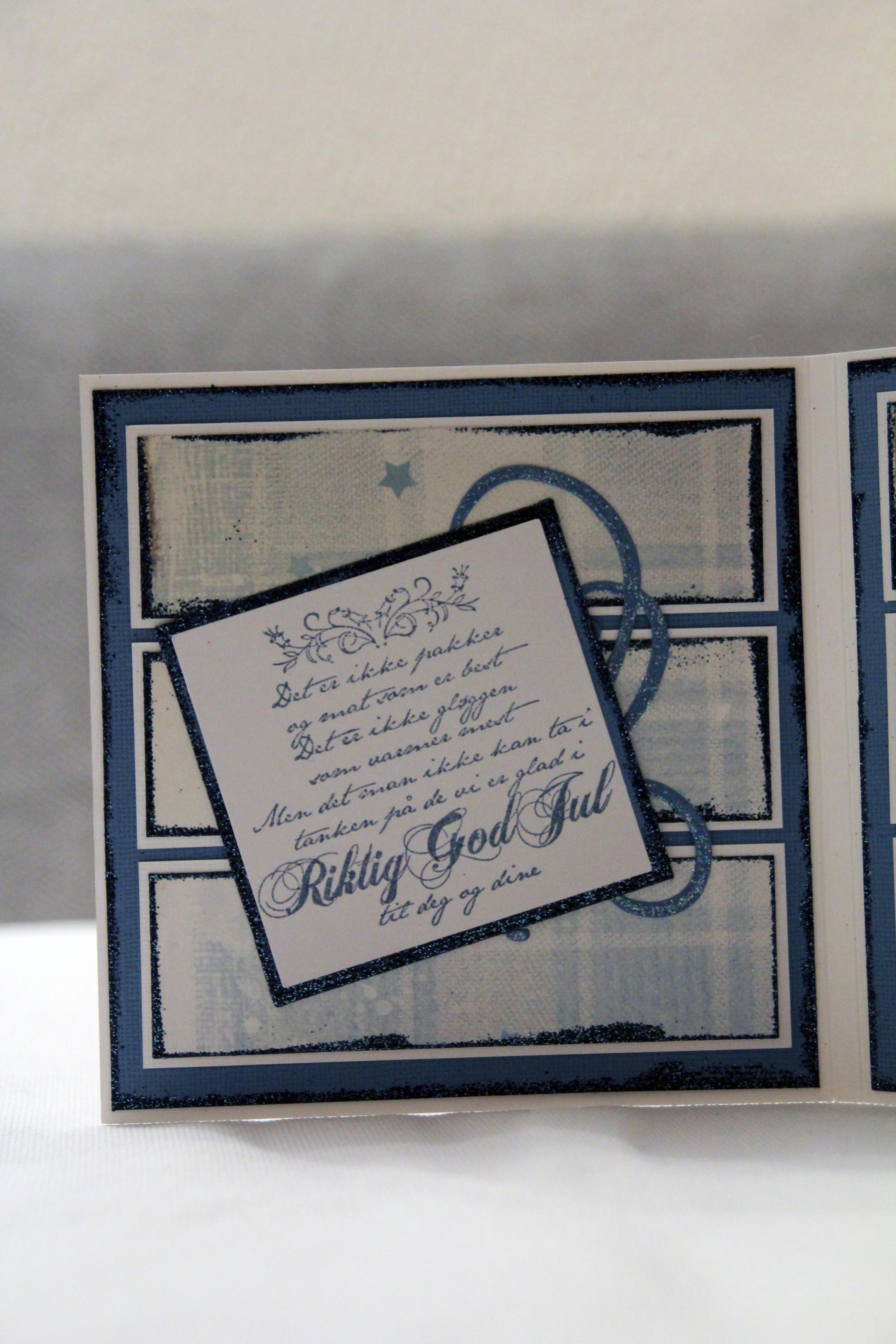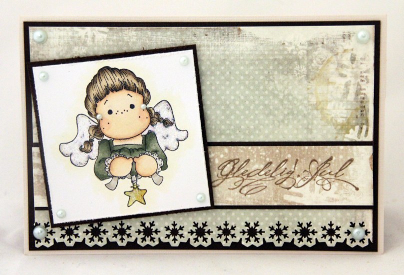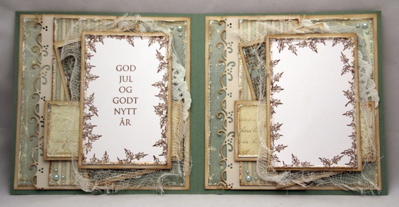 En annen ting som er genialt med posekort er at man får brukt rester. Jeg bruker stort sett så mye materialer på mine kort at det ikke blir supermasse rester igjen (er det sant??), men det er uansett fint å bruke rester til dette formålet. På dette kortet har jeg brukt “Ventetid” fra Poppydesigns Juledrømmer-kolleksjon, og arket “Juldikt” fra Pion Designs Väntan på tomten II-kolleksjon. Fra Pion Design har jeg også brukt “Klippark” og “Tagsark”, samt “Bårder”. Stjernene jeg har punchet ut har fått et lag med stickles star dust, juletrecharmen kommer fra Kort og Godt.