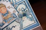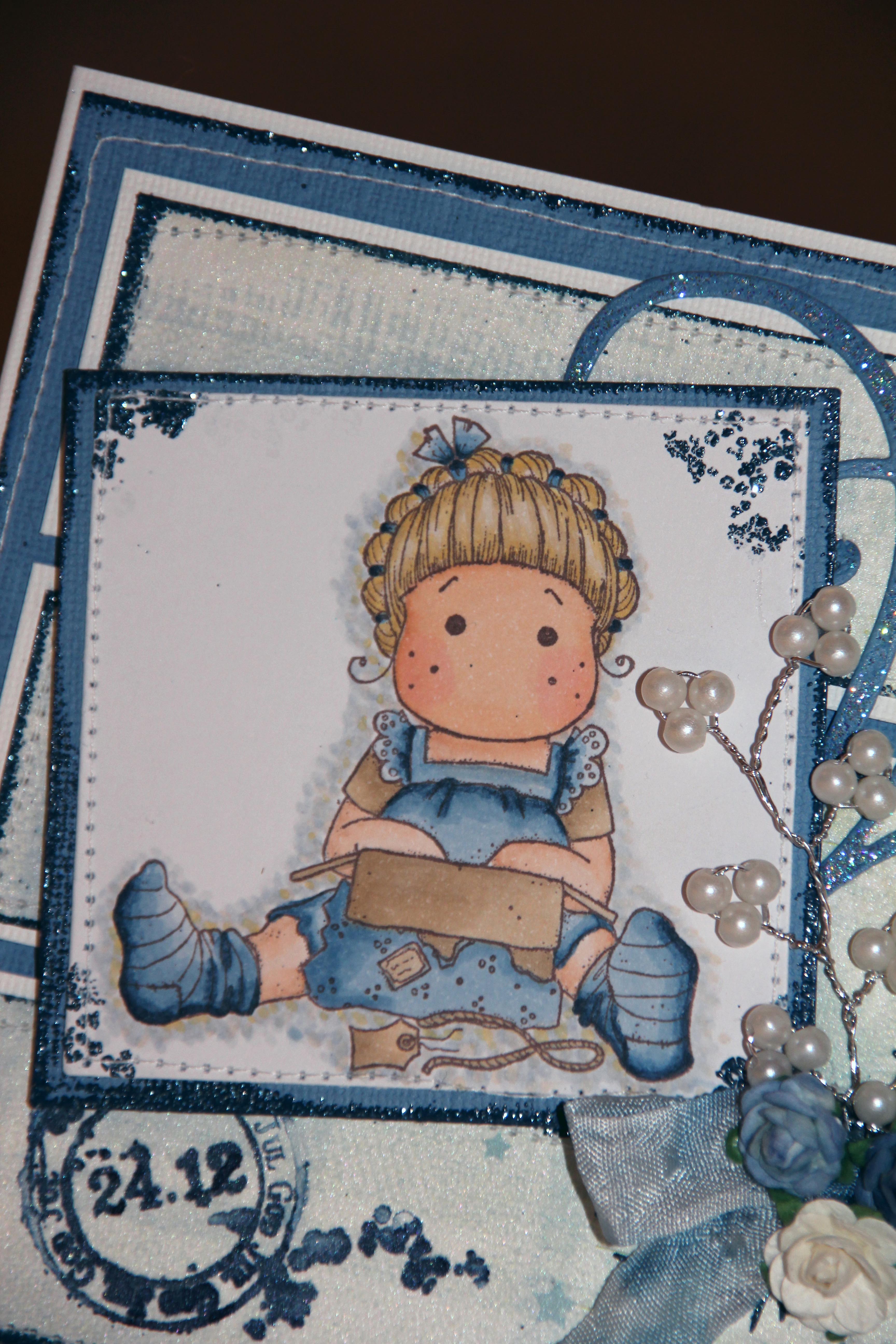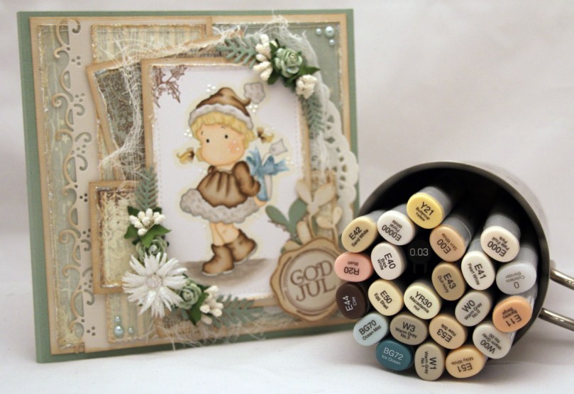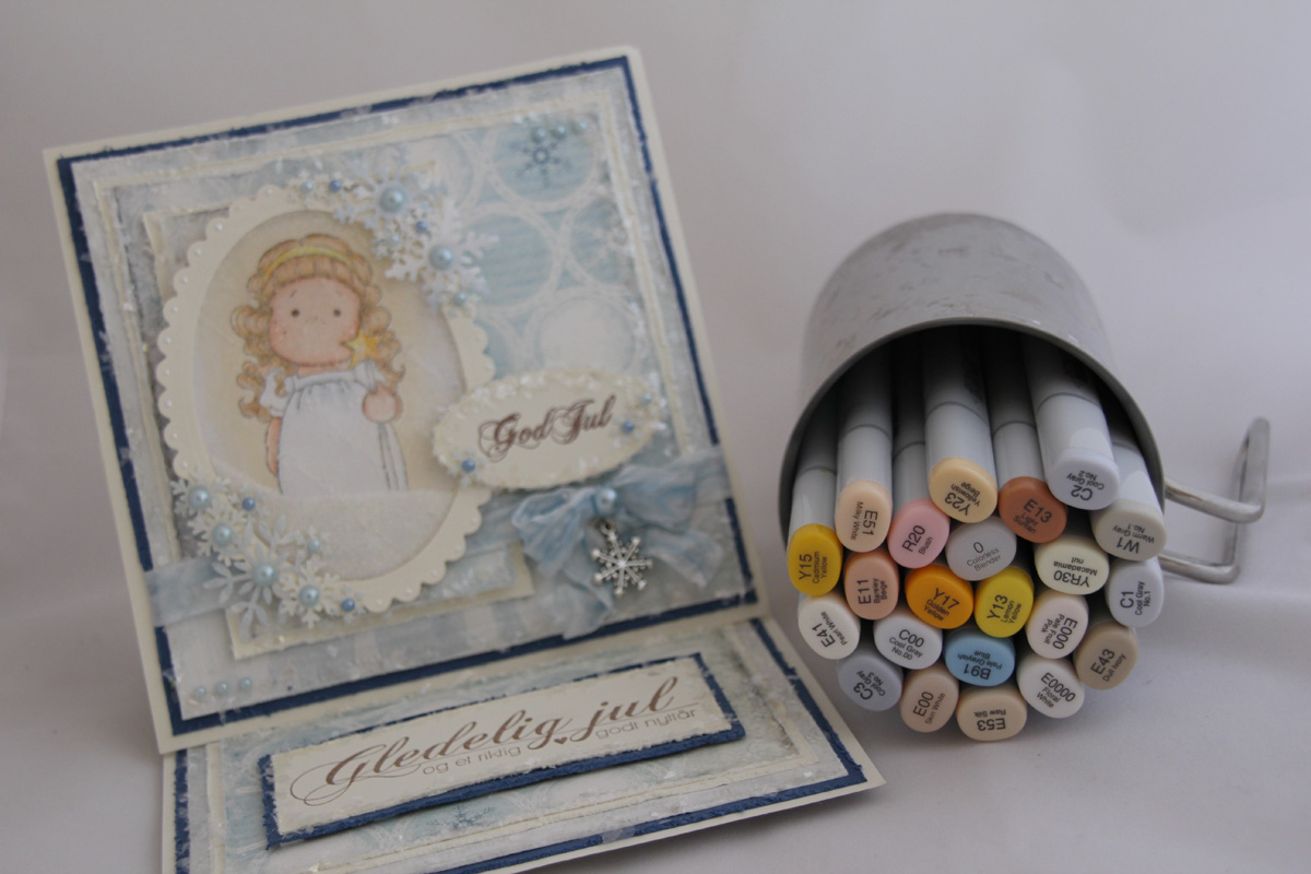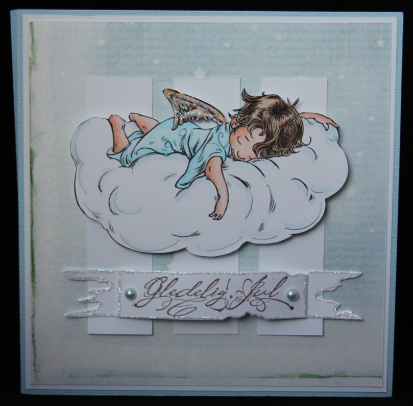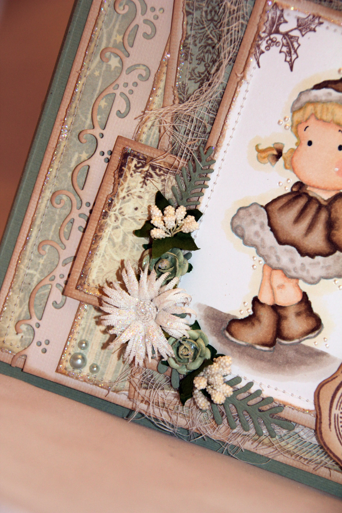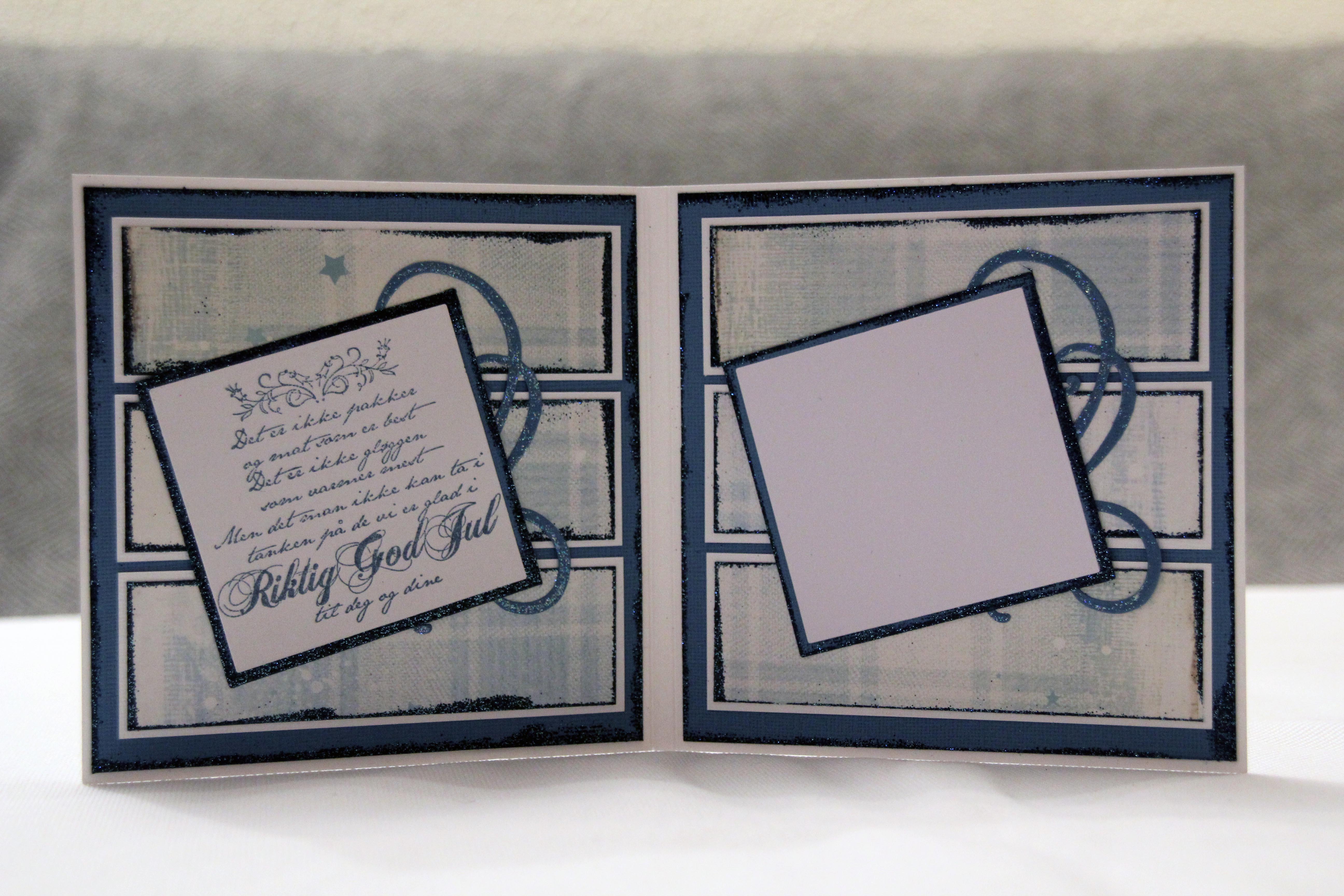 En annen ting som er genialt med posekort er at man får brukt rester. Jeg bruker stort sett så mye materialer på mine kort at det ikke blir supermasse rester igjen (er det sant??), men det er uansett fint å bruke rester til dette formålet. På dette kortet har jeg brukt “Ventetid” fra Poppydesigns Juledrømmer-kolleksjon, og arket “Juldikt” fra Pion Designs Väntan på tomten II-kolleksjon. Fra Pion Design har jeg også brukt “Klippark” og “Tagsark”, samt “Bårder”. Stjernene jeg har punchet ut har fått et lag med stickles star dust, juletrecharmen kommer fra Kort og Godt.