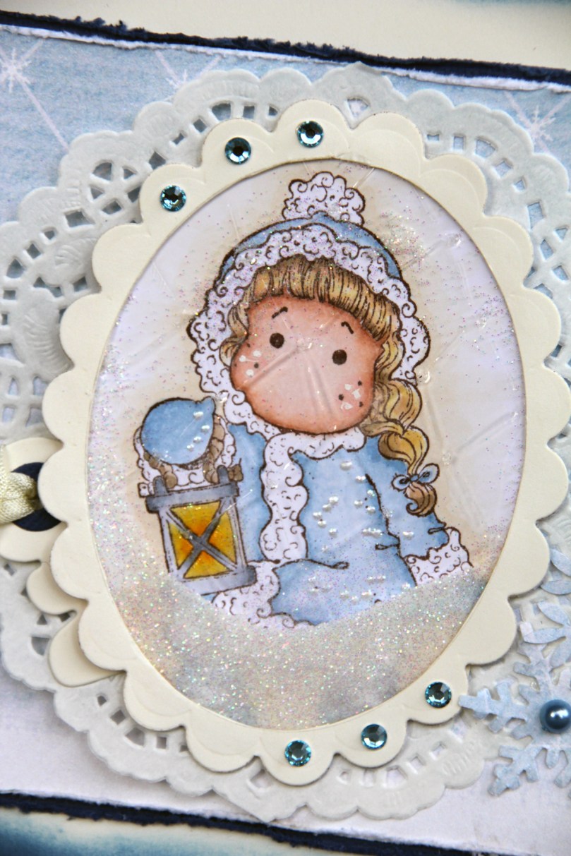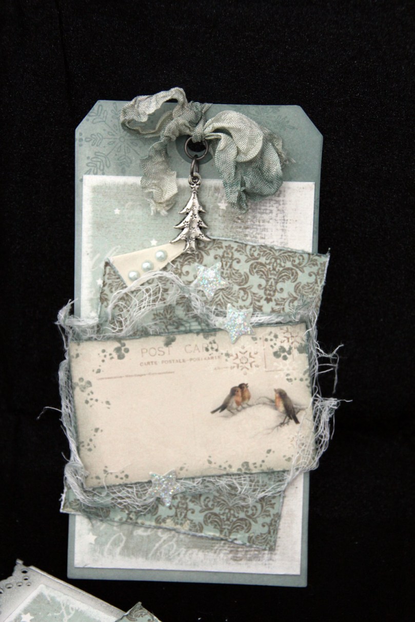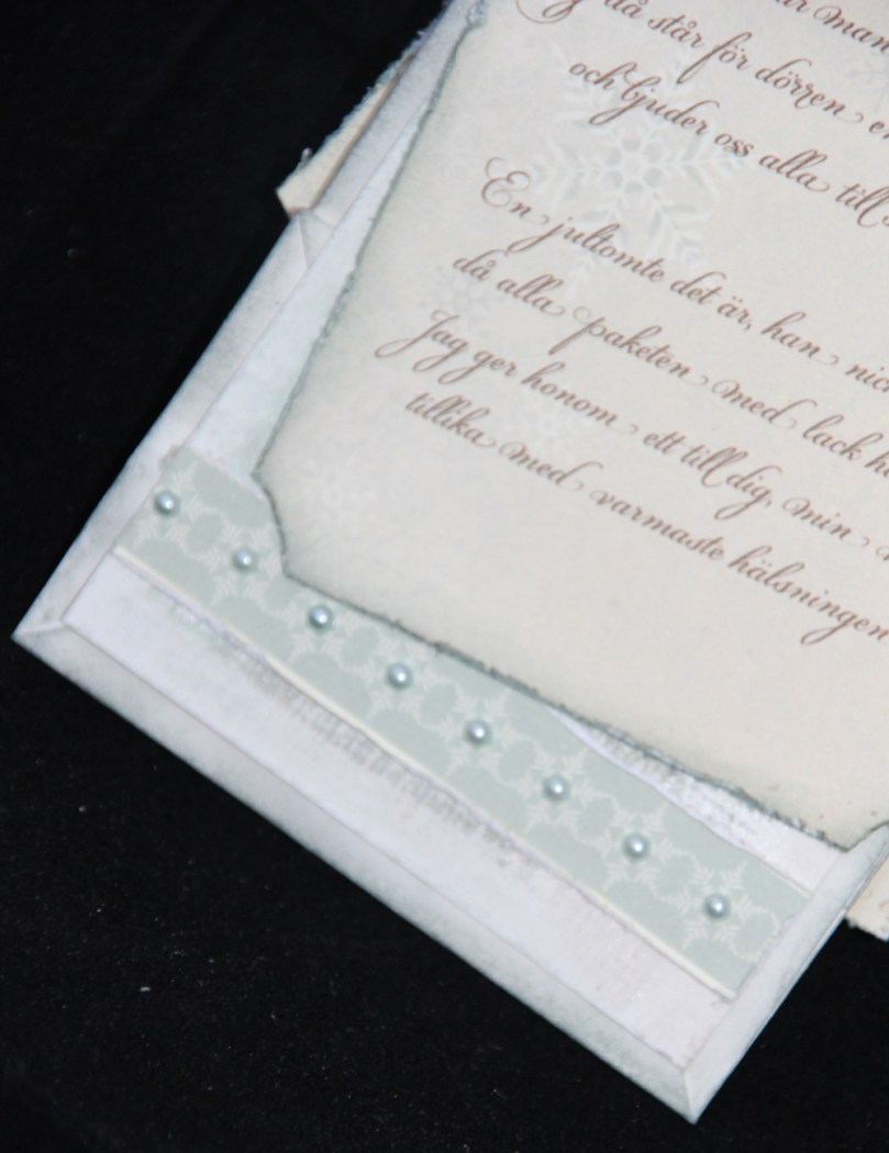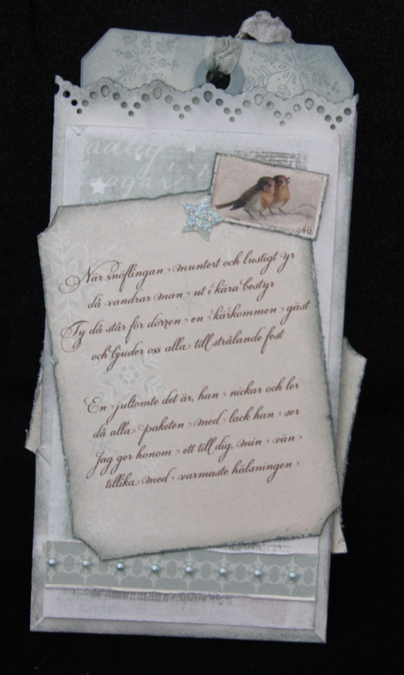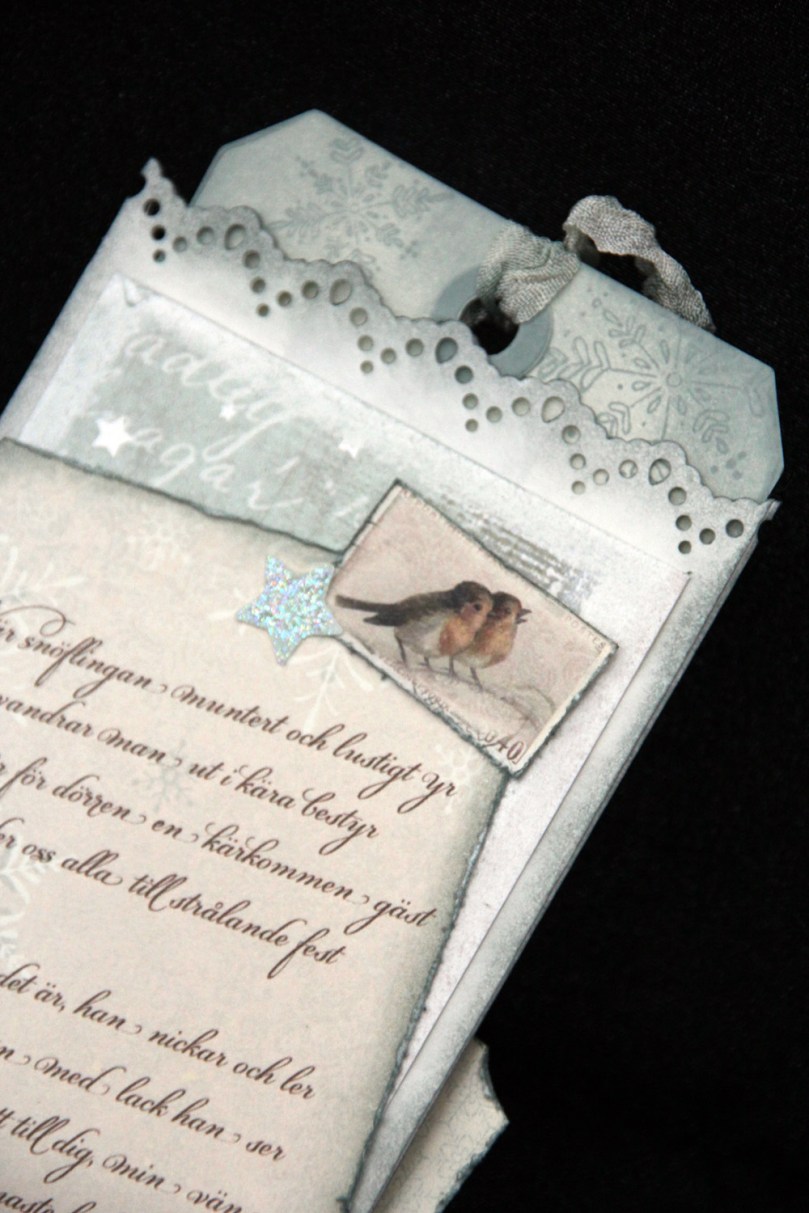 Tagen som er inni posen har samme utforming som fronten. Flere stjerner, flere dompaper og flere perler. Postkortet har blitt stemplet med deler av 24.12-poststempelet til Inkido rundt kanten med Iced Spruce. Har også lagt osteklut bak postkortet. Selve tagen er stanset ut med en die fra TH (Tag & bookplates-dies) i hvit, glatt bazzill. Har svertet rikelig med Iced Spruce (så den ser ikke hvit ut lengre) og stemplet et snøflakstempel fra Magnolia på tagen. Seam binding også fargelagt med Iced Spruce (helt fantastisk farge!!).