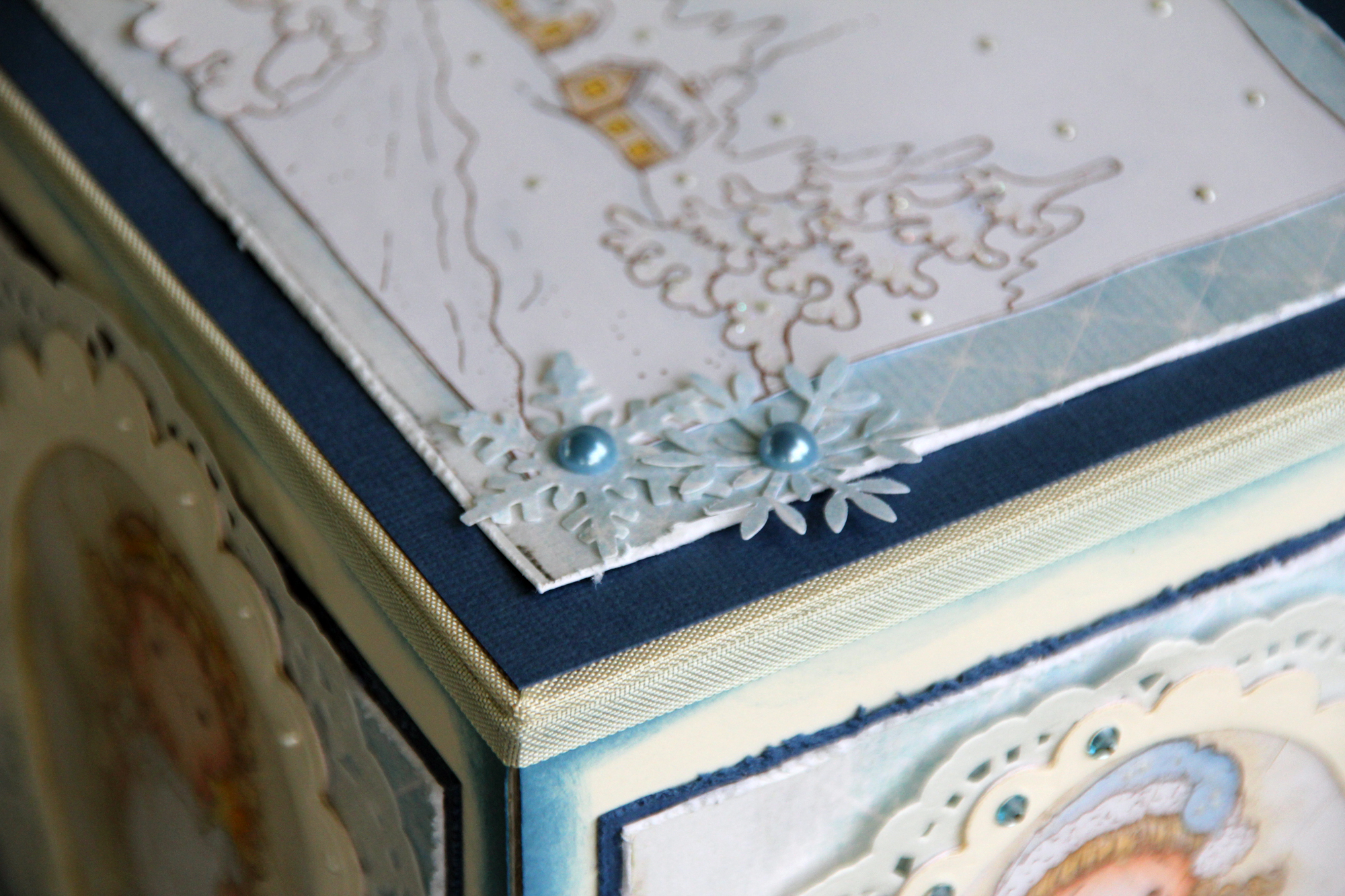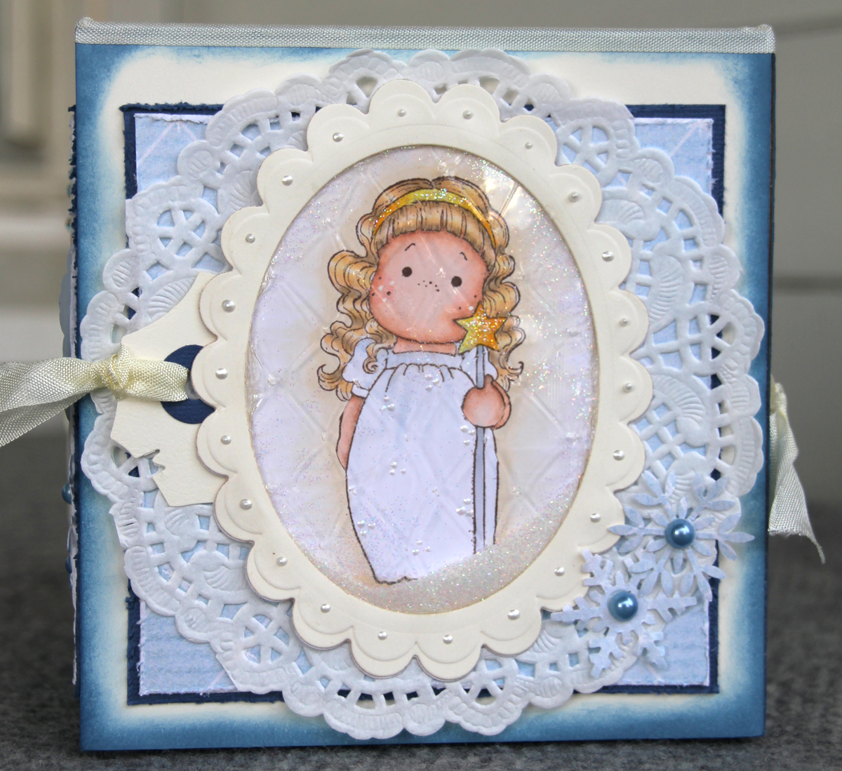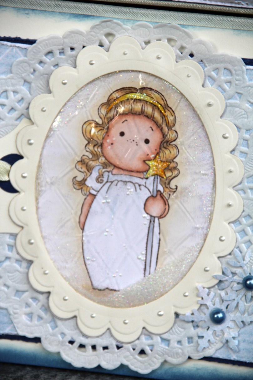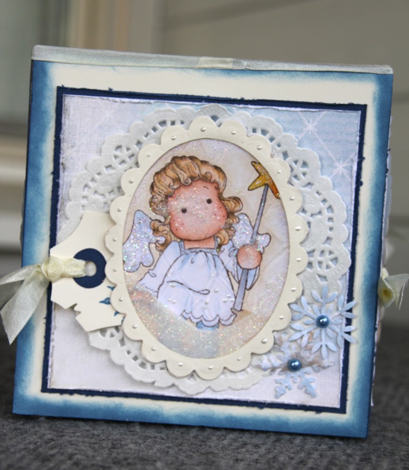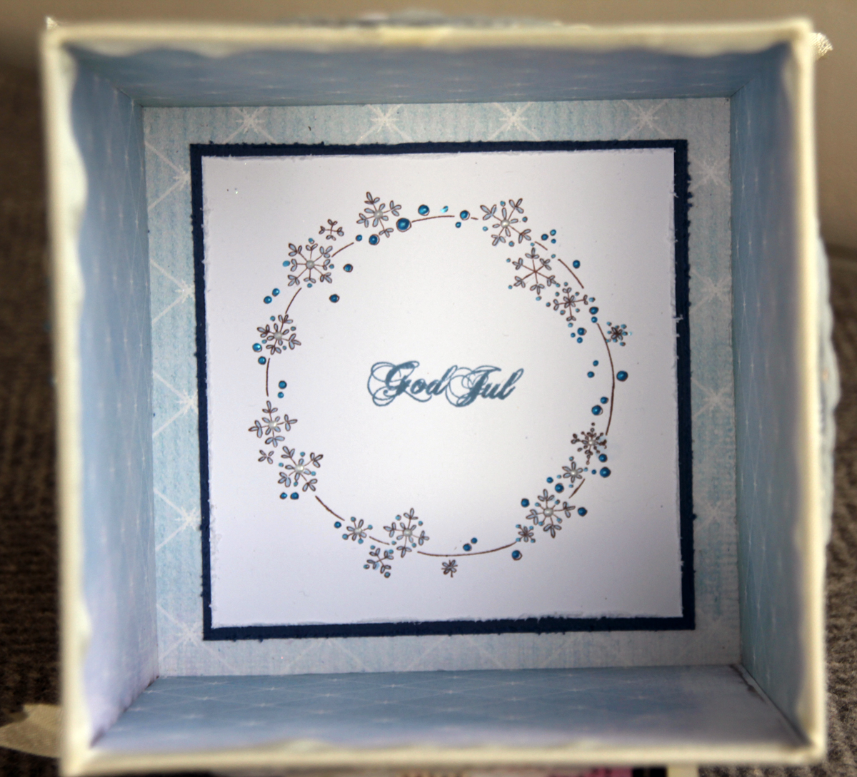 Tagen som er inni posen har samme utforming som fronten. Flere stjerner, flere dompaper og flere perler. Postkortet har blitt stemplet med deler av 24.12-poststempelet til Inkido rundt kanten med Iced Spruce. Har også lagt osteklut bak postkortet. Selve tagen er stanset ut med en die fra TH (Tag & bookplates-dies) i hvit, glatt bazzill. Har svertet rikelig med Iced Spruce (så den ser ikke hvit ut lengre) og stemplet et snøflakstempel fra Magnolia på tagen. Seam binding også fargelagt med Iced Spruce (helt fantastisk farge!!).