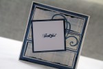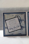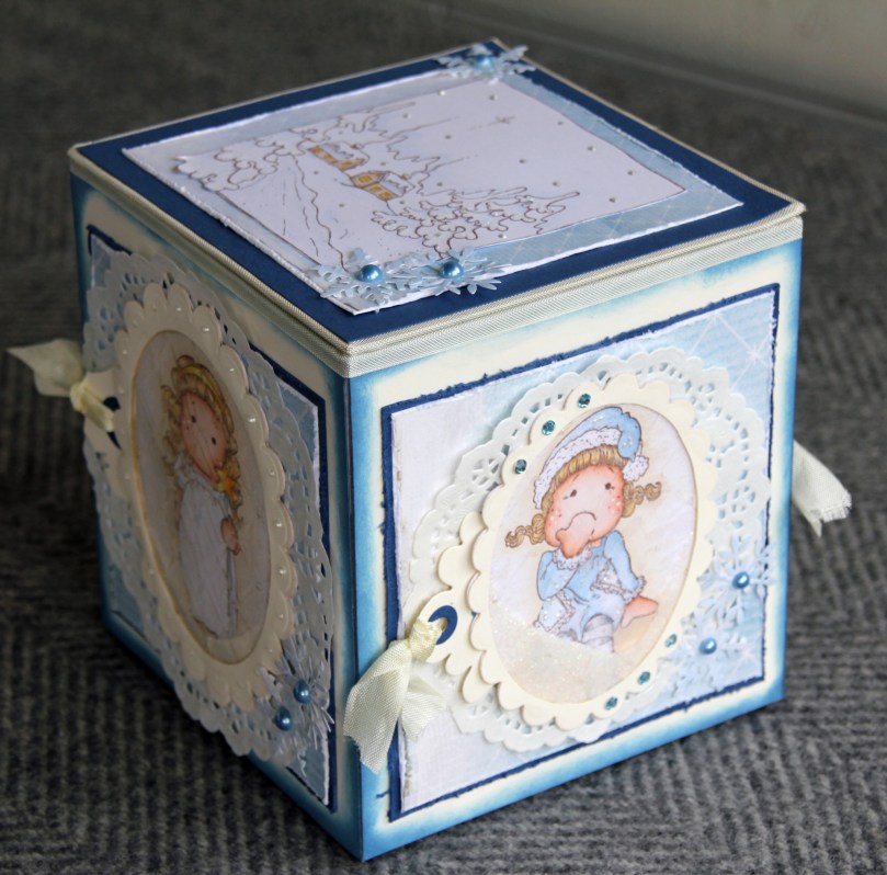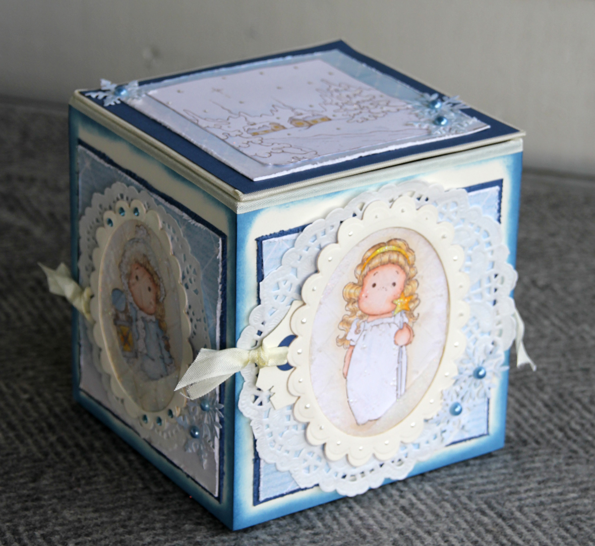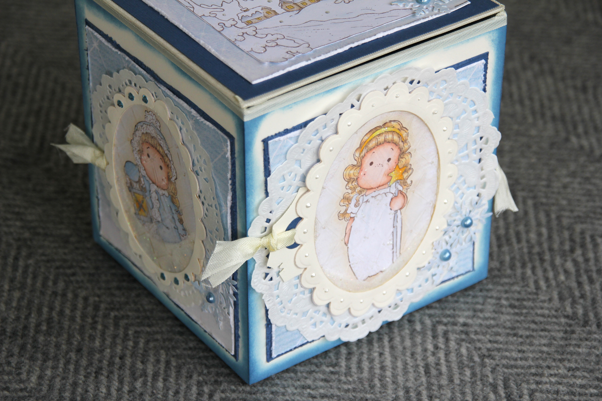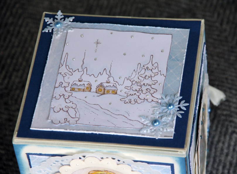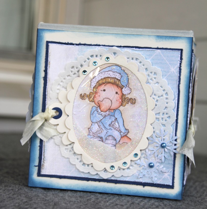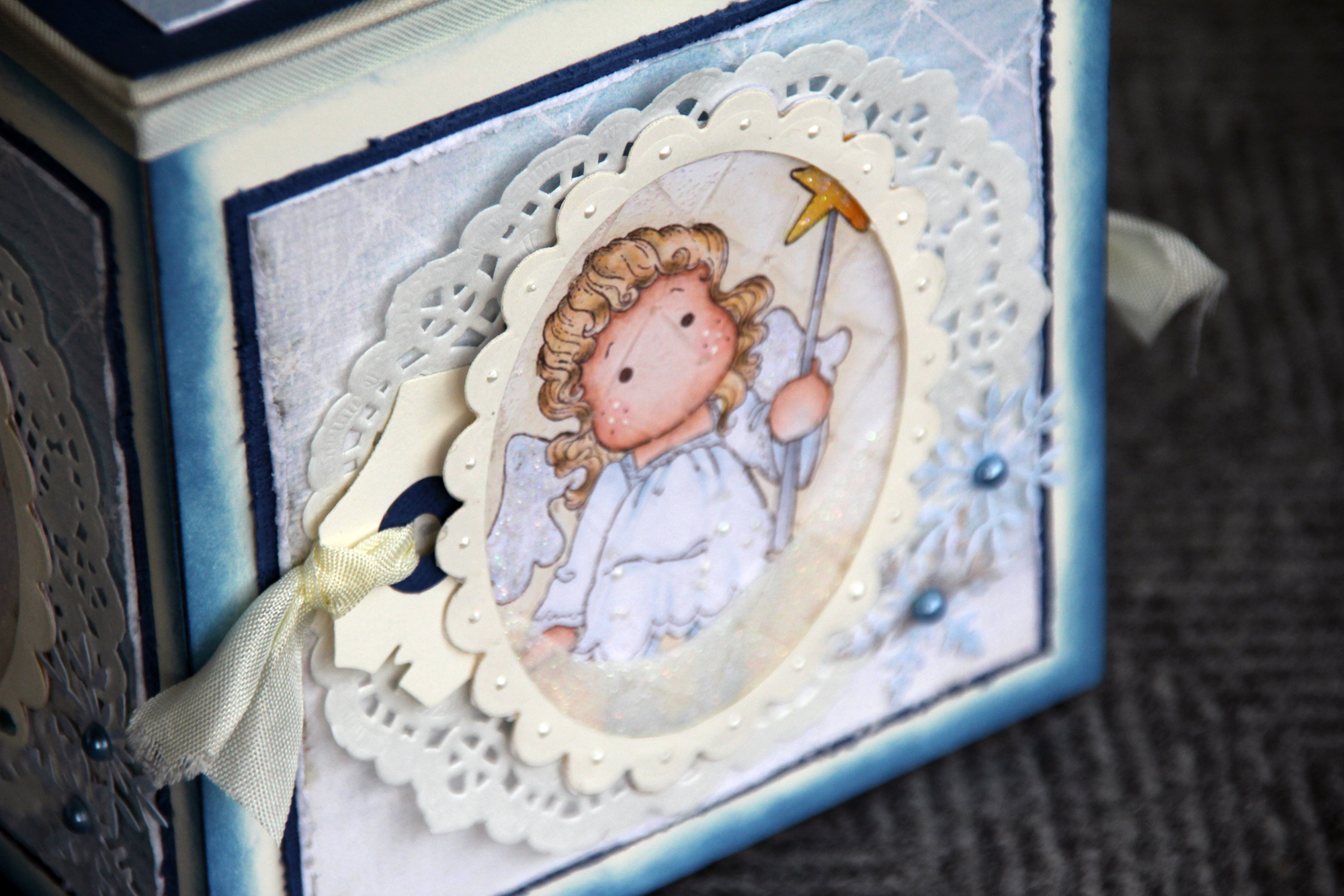 Tagen som er inni posen har samme utforming som fronten. Flere stjerner, flere dompaper og flere perler. Postkortet har blitt stemplet med deler av 24.12-poststempelet til Inkido rundt kanten med Iced Spruce. Har også lagt osteklut bak postkortet. Selve tagen er stanset ut med en die fra TH (Tag & bookplates-dies) i hvit, glatt bazzill. Har svertet rikelig med Iced Spruce (så den ser ikke hvit ut lengre) og stemplet et snøflakstempel fra Magnolia på tagen. Seam binding også fargelagt med Iced Spruce (helt fantastisk farge!!).