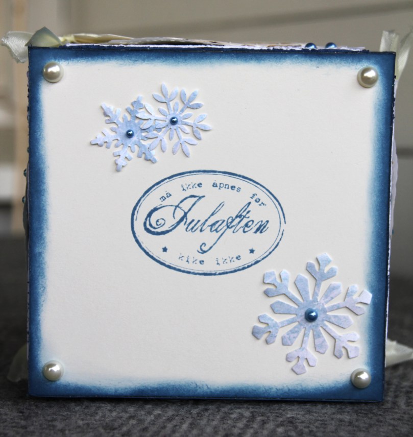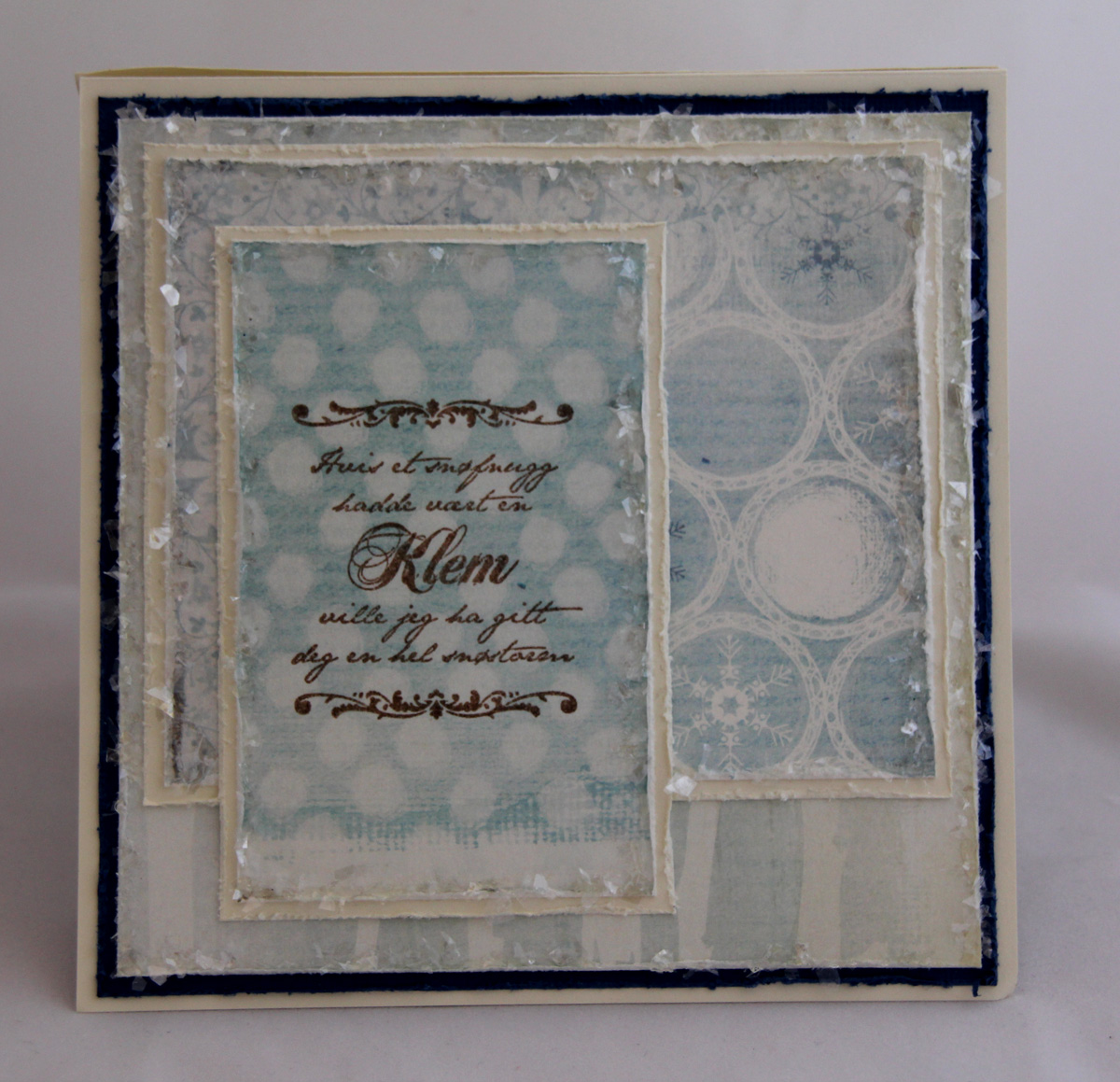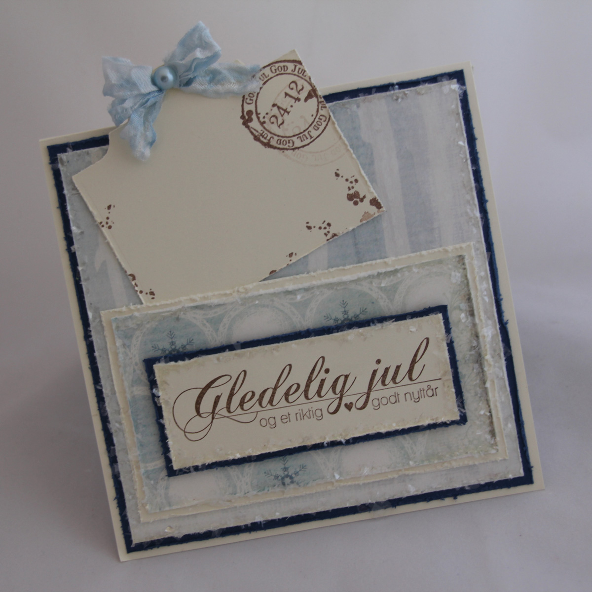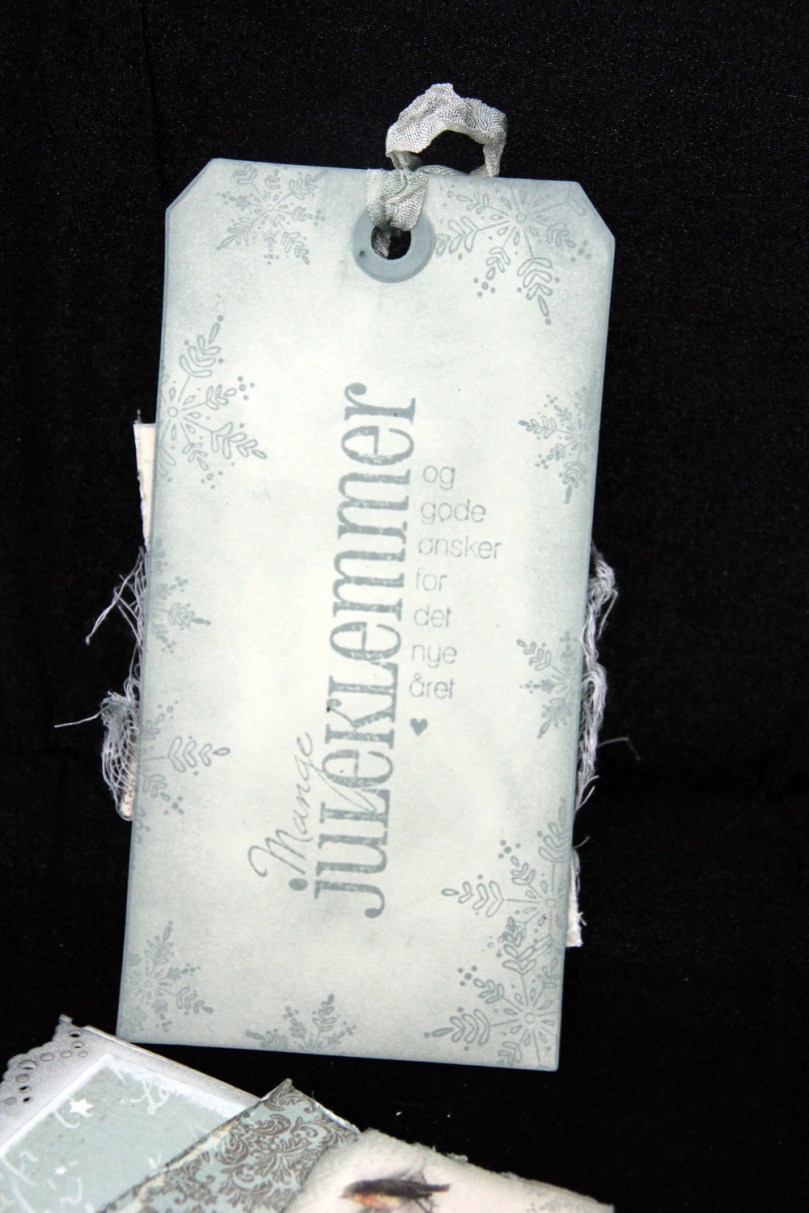 Baksiden av tagen har også blitt svertet med Iced Spruce og så blitt stemplet med snøflakstempelet fra Magnolia. “Mange juleklemmer..”-stempelet er fra Norsk Stempelblad.