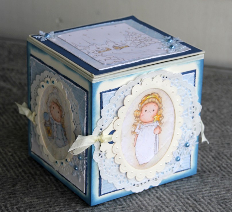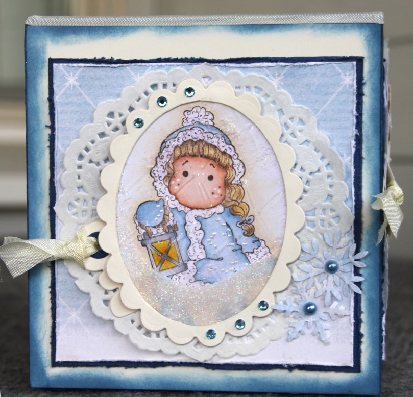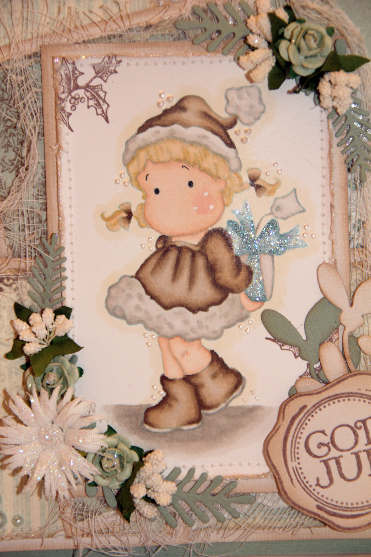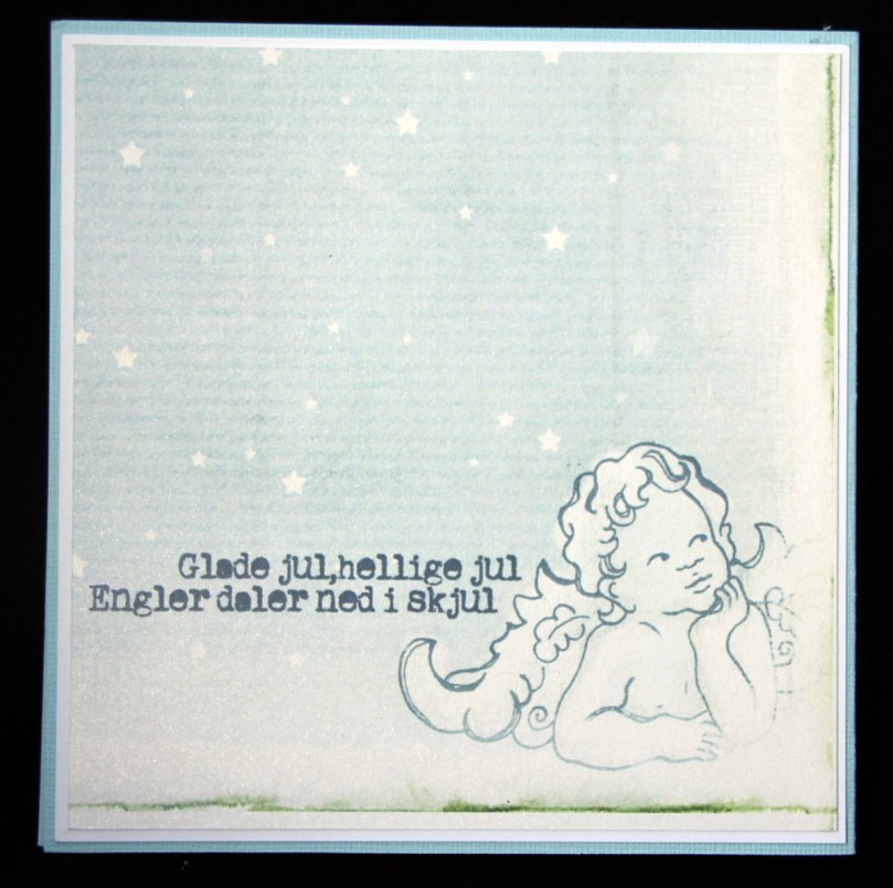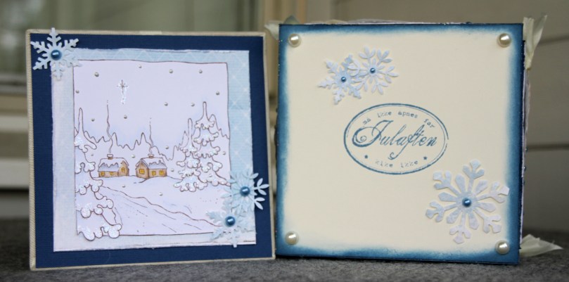 Baksiden av tagen har også blitt svertet med Iced Spruce og så blitt stemplet med snøflakstempelet fra Magnolia. “Mange juleklemmer..”-stempelet er fra Norsk Stempelblad.