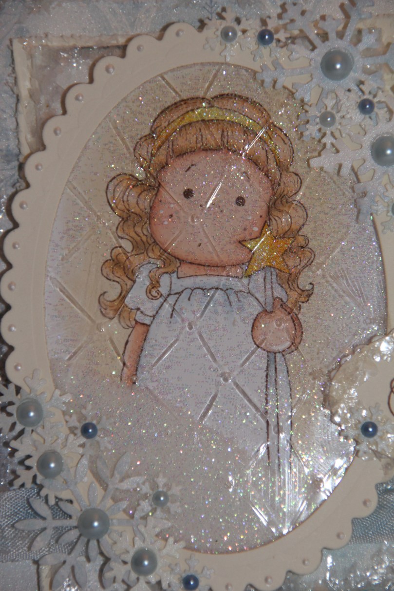 Dompapene på frimerket har fått selskap av en punchet stjerne med stickles. Alle kanter er rufset med edge distresser og svertet med Distress inkpute Iced Spruce.