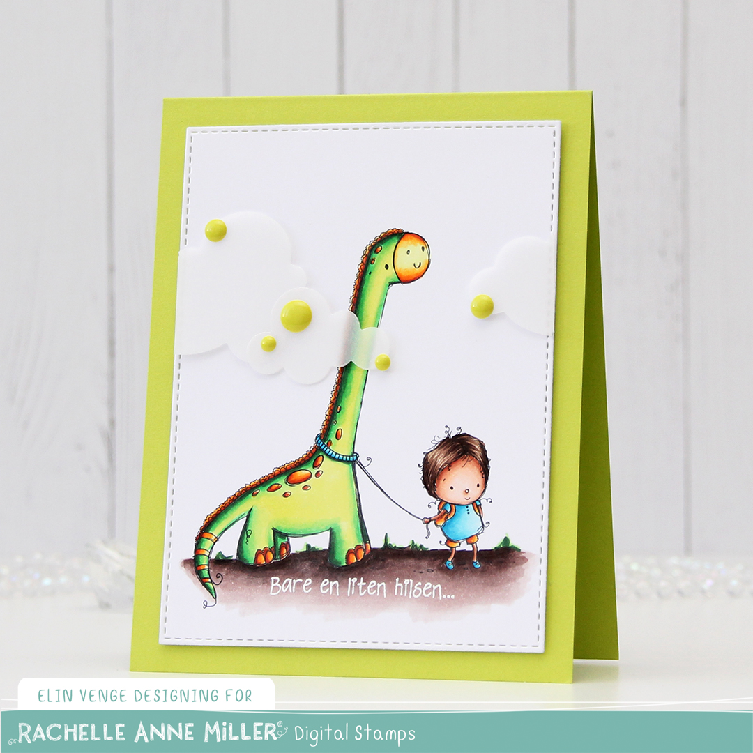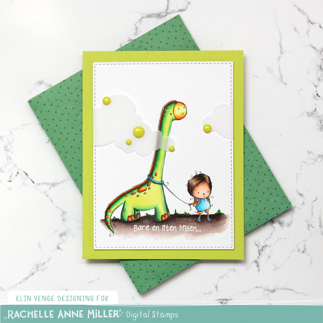 I added some vellum clouds on tiny pieces of foam tape, so it looks like the dinosaur’s neck is really long, I thought that was a fun little detail to add. Placed some enamel dots from Papirdesign in strategic places to cover the foam tape, and made an envelope from Papirdesign patterned paper using the A2 V flap envelope dies from Simon Says Stamp for the card to go in.