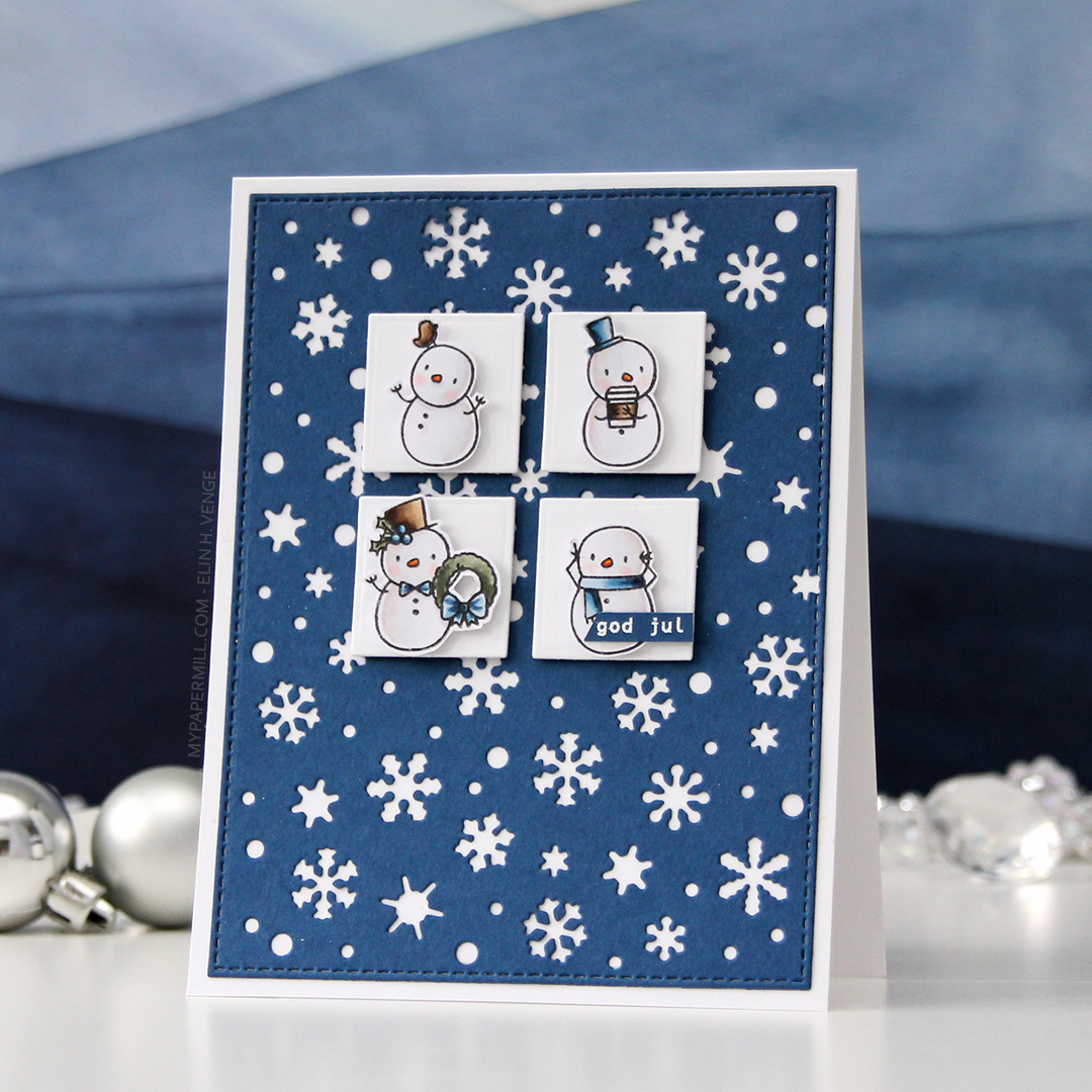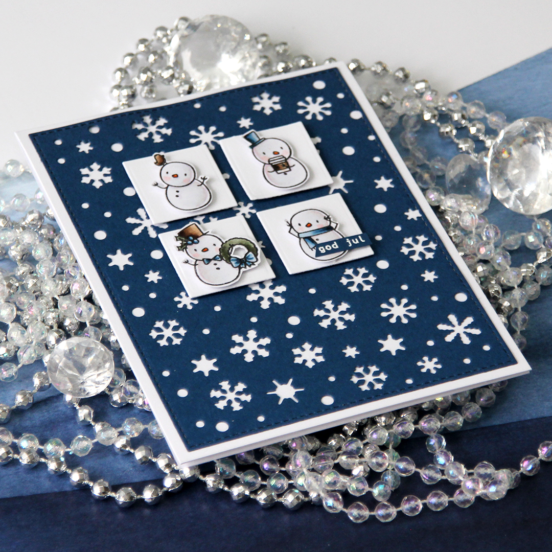 After coloring all my snowmen with Copics, I added a sprinkling of chunky white embossing enamel from Stampendous and heated my panel from the back until all the granules had melted. It warped quite a bit, so I ran the panel through my Gemini Jr without any dies, just sandwiching the panel between my cutting plates. That took care of the warping, and I could continue by gluing the panel of snowmen to the cardbase, before popping up a Norsk Stempelblad AS heart sentiment that I stamped using Autumn Rose ink. I also added a few Crafty Moly snowflakes that I covered in three layers of white embossing powder.