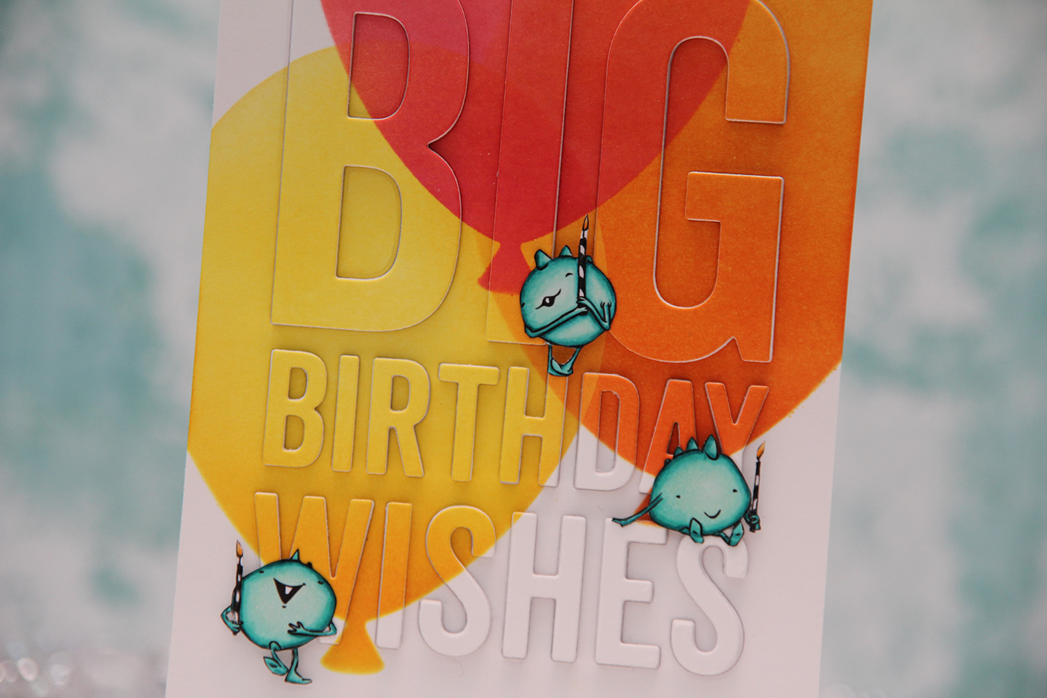 I die cut the Big Birthday Wishes die from My Favorite Things five times from Stamper’s Select White card stock from Papertrey Ink, as well as from the blended piece, which is also Stamper’s Select White. It’s my favorite white card stock, I haven’t found one that’s more white than this, and it’s also wonderfully sturdy at 110 lb. I did a layered inlay, then fussy cut my monsters and placed them strategically on my card. I love that the top one looks like he’s balancing on the top of the H, and the one on the right is leaning on the E while dangling his feet from the top of the S.