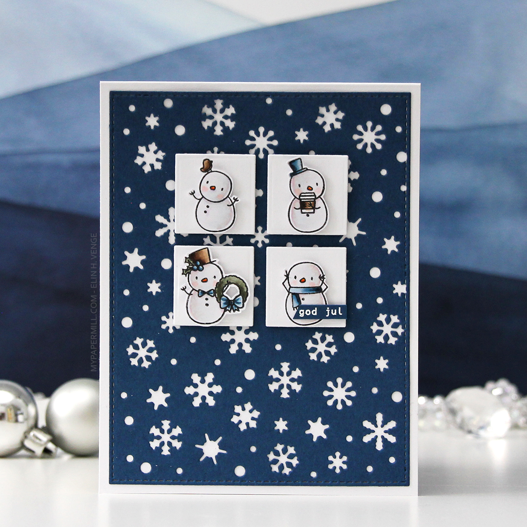 After coloring all my snowmen with Copics, I added a sprinkling of chunky white embossing enamel from Stampendous and heated my panel from the back until all the granules had melted. It warped quite a bit, so I ran the panel through my Gemini Jr without any dies, just sandwiching the panel between my cutting plates. That took care of the warping, and I could continue by gluing the panel of snowmen to the cardbase, before popping up a Norsk Stempelblad AS heart sentiment that I stamped using Autumn Rose ink. I also added a few Crafty Moly snowflakes that I covered in three layers of white embossing powder.