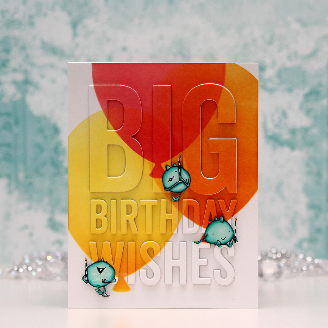 I die cut the Big Birthday Wishes die from My Favorite Things five times from Stamper’s Select White card stock from Papertrey Ink, as well as from the blended piece, which is also Stamper’s Select White. It’s my favorite white card stock, I haven’t found one that’s more white than this, and it’s also wonderfully sturdy at 110 lb. I did a layered inlay, then fussy cut my monsters and placed them strategically on my card. I love that the top one looks like he’s balancing on the top of the H, and the one on the right is leaning on the E while dangling his feet from the top of the S.