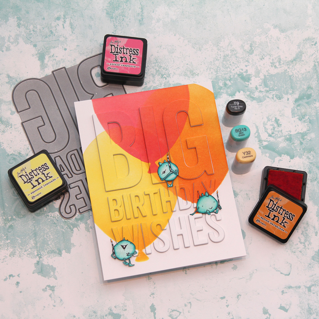 When my little monsters were all colored in with my Copics, I pulled out the Big Balloon stencil from My Favorite Things along with four different colors of distress ink. I created three balloons that overlap. All the balloons are ink blended using two colors. The yellow one is Squeezed Lemonade with Spiced Marmalade toward the base of the balloon, the orange one is Spiced Marmalade with Worn Lipstick at the base, and the top one is Worn Lipstick with Picked Raspberry at the base.