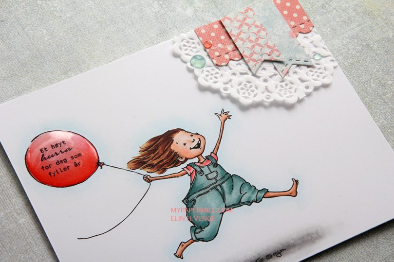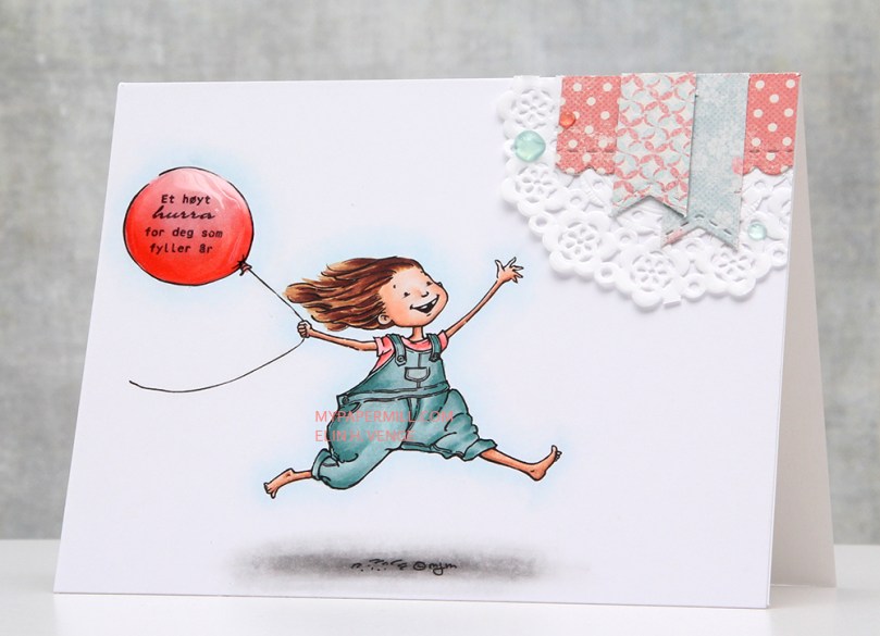 Jeg har fargelagt motivet Life is like a balloon på kortet mitt. Det er egentlig et sett med to motiver, det andre er av en hund (Bronte) som er festet i tre ballonger og flyr avgårde, men jeg har bare brukt jenta i dag. Som vanlig er hun fargelagt med Copics på X-Press It, og hun er satt på en A2 base (5 1/2 x 4 1/4″) av Bazzill Marshmallow kartong.